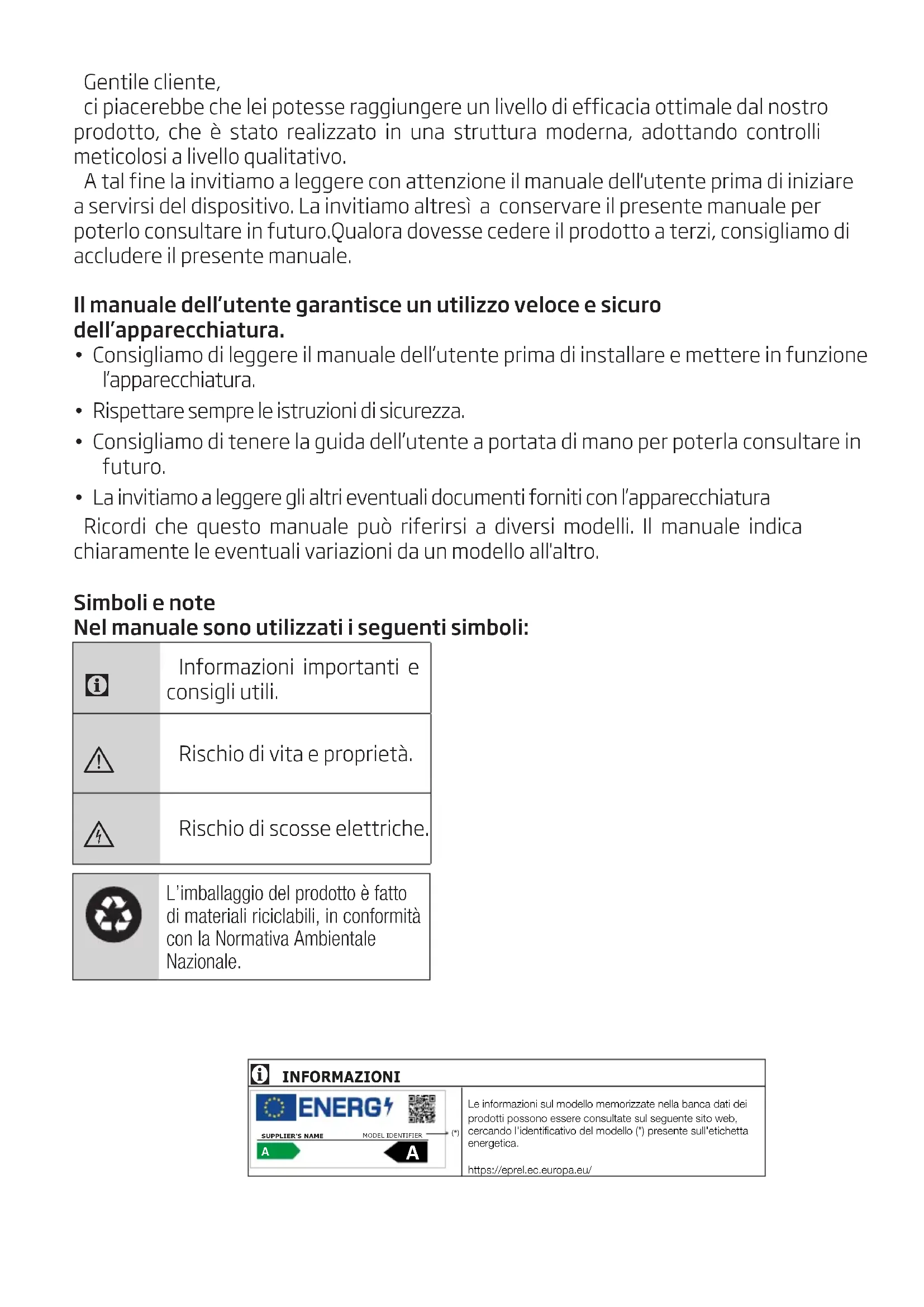- La invitiamo a leggere gli altri eventuali documenti forniti con l’apparecchiatura Ricordi che questo manuale può riferirsi a diversi modelli. Il manuale indica chiaramente le eventuali variazioni da un modello all'altro. Simboli e note Nel manuale sono utilizzati i seguenti simboli:
