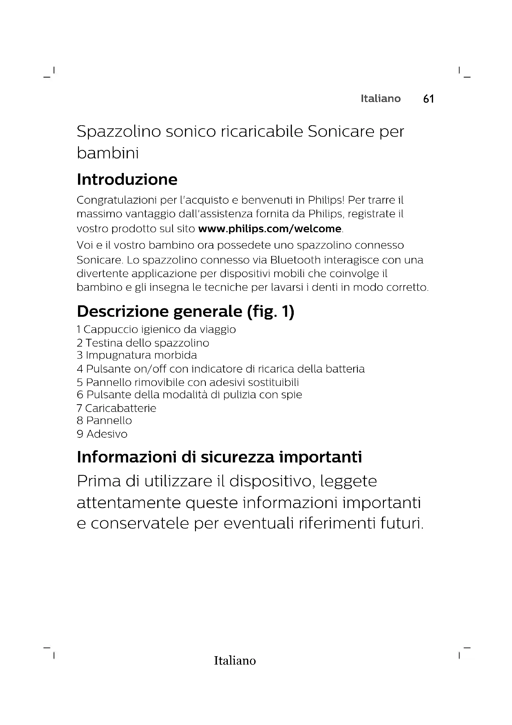 FrançaisItaliano Spazzolino sonico ricaricabile Sonicare per bambini Introduzione Congratulazioni per l'acquisto e benvenuti in Philips! Per trarre il massimo vantaggio dall'assistenza fornita da Philips, registrate il vostro prodotto sul sito www.philips.com/welcome. Voi e il vostro bambino ora possedete uno spazzolino connesso Sonicare. Lo spazzolino connesso via Bluetooth interagisce con una divertente applicazione per dispositivi mobili che coinvolge il bambino e gli insegna le tecniche per lavarsi i denti in modo corretto. Descrizione generale (fig. 1) 1 Cappuccio igienico da viaggio 2 Testina dello spazzolino 3 Impugnatura morbida 4 Pulsante on/off con indicatore di ricarica della batteria 5 Pannello rimovibile con adesivi sostituibili 6 Pulsante della modalità di pulizia con spie 7 Caricabatterie 8 Pannello 9 Adesivo Informazioni di sicurezza importanti Prima di utilizzare il dispositivo, leggete attentamente queste informazioni importanti e conservatele per eventuali riferimenti futuri.