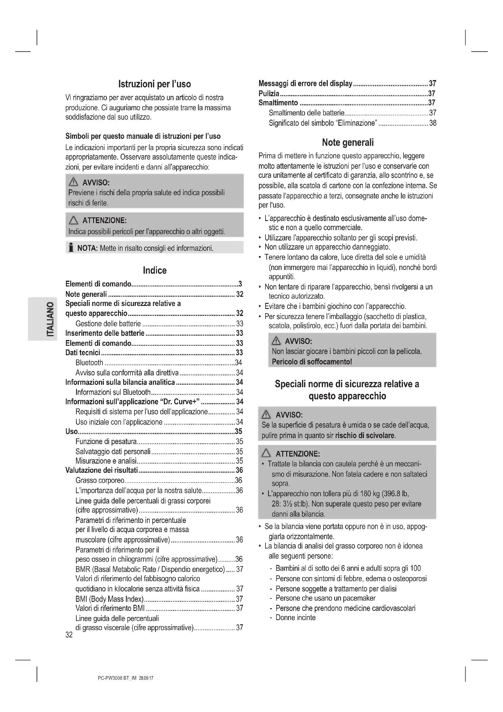 - ca. 15 metri Frequenza di trasmissione: ,4 GHz Si riserva il diritto di apportare modifiche tecniche e di design nel corso dello sviluppo del prodotto. Avviso sulla conformità alla direttiva Il fabbricante, Clatronic International GmbH, dichiara che il tipo di apparecchiatura radio PC-PW 3008 BT è conforme alla direttiva 2014 / 53 / UE. Inoltre, l’apparecchio è conforme ai requisiti della direttiva RoHS 2011 / 65 / CE. Il testo completo della dichiarazione di conformità UE è disponibile al seguente indirizzo Internet: www.sli24.de Nell‘area per i download, si prega di inserire il nome del modello PC-PW 3008 BT. Testato per il funzionamento in Italia. Informazioni sulla bilancia analitica AVVISO: Non usare le bilance se si utilizza un pacemaker o un’altra apparecchiatura medica impiantata con componenti elettro- nici. Il funzionamento dell’apparecchiatura può presentare anomalie causate dall’apparecchio di misurazione. Il principio principale di questo dispositivo è basato sulla misurazione di impedenza elettronica all’interno del corpo umano. Per determinare i dati reali del corpo, il dispositivo emette un segnale debole, impercettibile attraverso il corpo. Il segnale è generalmente sicuro! Tuttavia, leggere le partico- lari istruzioni di sicurezza! Il metodo di misurazione si riferisce all’ “analisi dell’impe- denza bioelettronica” (BIA), un fattore che si basa sulla rela- zione tra il peso del corpo e percentuali dell’acqua corporea associata, nonché su altri dati biologici (età, genere, peso corporeo). Informazioni sul Bluetooth Il Bluetooth è una tecnologia per la connessione wireless remota di dispositivi a breve distanza. I dispositivi con lo standard Bluetooth trasmettono nella banda ISM (Industrial, Scientific and Medical) tra 2,402 e 2,480 GHz. L’interferenza può essere causata ad es. da reti WLAN, radio DAB, telefoni senza fili, forni a microonde che funzionano nella stessa gamma di frequenza. Queste scale offrono la possibilità di inviare i dati calcolati tramite Bluetooth al proprio smartphone o PC tablet. Altre in- formazioni possono essere trovate nella sezione successiva (Informazioni sull’applicazione “Dr. Curve+”). Per la presenza di diversi produttori di dispositivi, modelli e versioni di software, non è garantita la funzionalità completa. Informazioni sull’applicazione “Dr. Curve+” L’app Dr.Curve+ è disponibile per android e iOS. Scansio- nare il codice QR corrispondente per accedere direttamente al download. NOTA: In base al provider possono essere applicati costi derivanti dal download dell’applicazione. Google Play App Store Inoltre, il link per scaricare l’app può essere trovato sulla nostra pagina internet: Requisiti di sistema per l’uso dell’applicazione p. 2