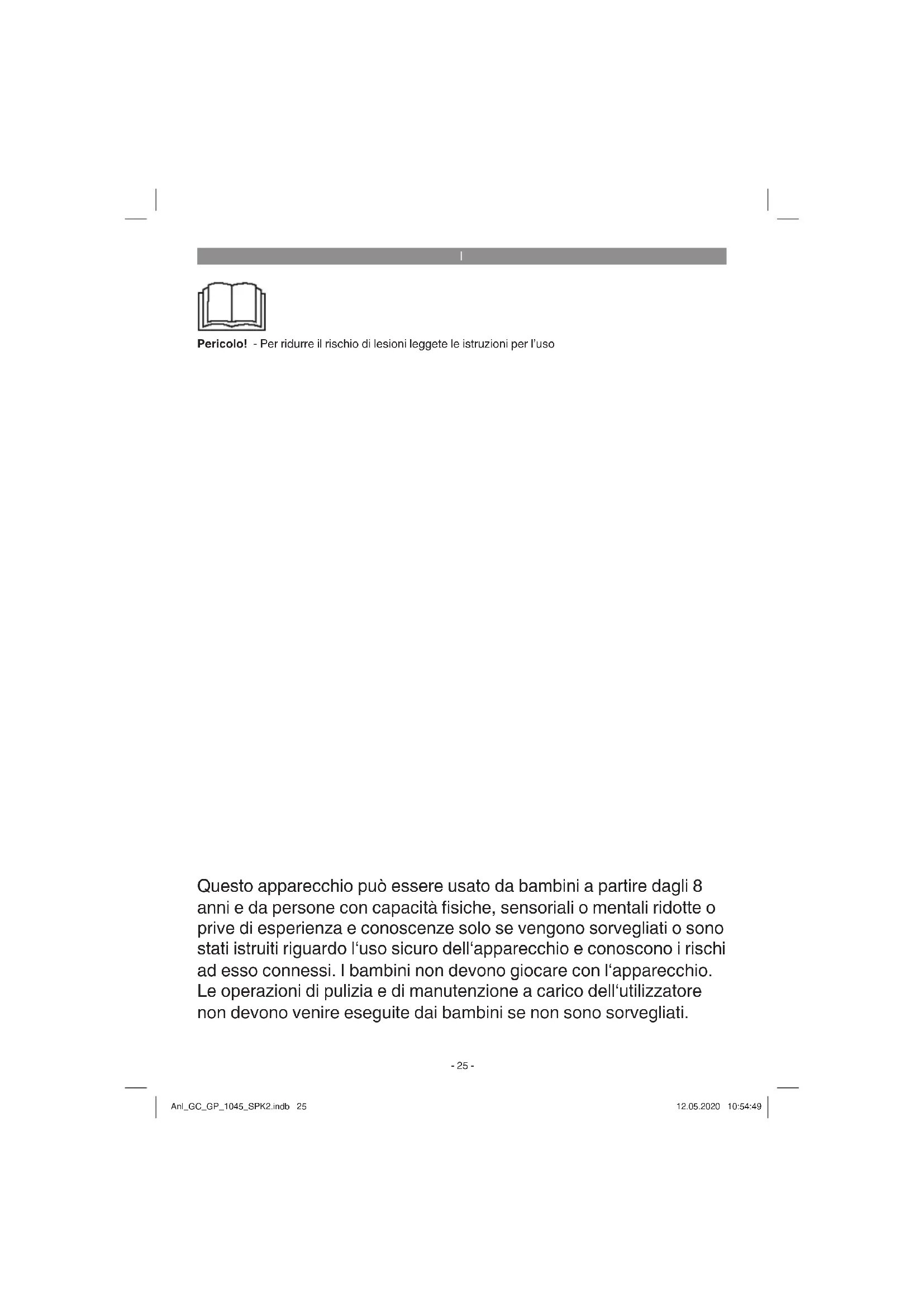 Pericolo! - Per ridurre il rischio di lesioni leggete le istruzioni per l’uso Questo apparecchio può essere usato da bambini a partire dagli 8 anni e da persone con capacità fi siche, sensoriali o mentali ridotte o prive di esperienza e conoscenze solo se vengono sorvegliati o sono stati istruiti riguardo l‘uso sicuro dell‘apparecchio e conoscono i rischi ad esso connessi. I bambini non devono giocare con l‘apparecchio. Le operazioni di pulizia e di manutenzione a carico dell‘utilizzatore non devono venire eseguite dai bambini se non sono sorvegliati. Anl_GC_GP_1045_SPK2.indb 25Anl_GC_GP_1045_SPK2.indb 25 12.05.2020 10:54:4912.05.2020 10:54:49I
