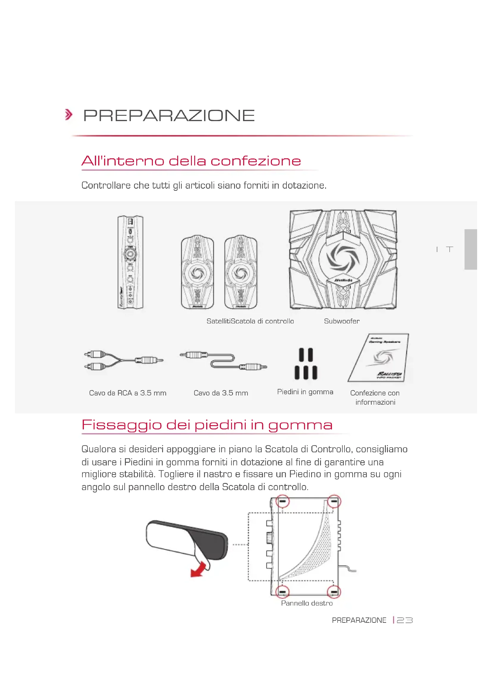 Fissaggio dei piedini in gomma Qualora si desideri appoggiare in piano la Scatola di Controllo, consigliamo di usare i Piedini in gomma forniti in dotazione al fine di garantire una migliore stabilità. Togliere il nastro e fissare un Piedino in gomma su ogni angolo sul pannello destro della Scatola di controllo. Confezione con informazioni SatellitiScatola di controllo Cavo da 3.5 mm Pannello destro Piedini in gomma PREPARAZIONE All'interno della confezione Controllare che tutti gli articoli siano forniti in dotazione.24 PREPARAZIONE Panoramica della scatola di controllo 1 Pulsante di alimentazione 10 Uscita microfono 2 Pulsante modalità Assassino 11 Ingresso ausiliario 3 Interruttore sorgente 12 Ingresso audio sinistro 4 Manopola volume 13 Ingresso audio destro 5 Manopola alti 14 Uscita altoparlante sinistra 6 Manopola bassi 15 Uscita altoparlante destra 7 Uscita cuffia 16 Uscita Subwoofer 8 Ingresso microfono 17 Ingresso di alimentazione CA 9 Ingresso di linea