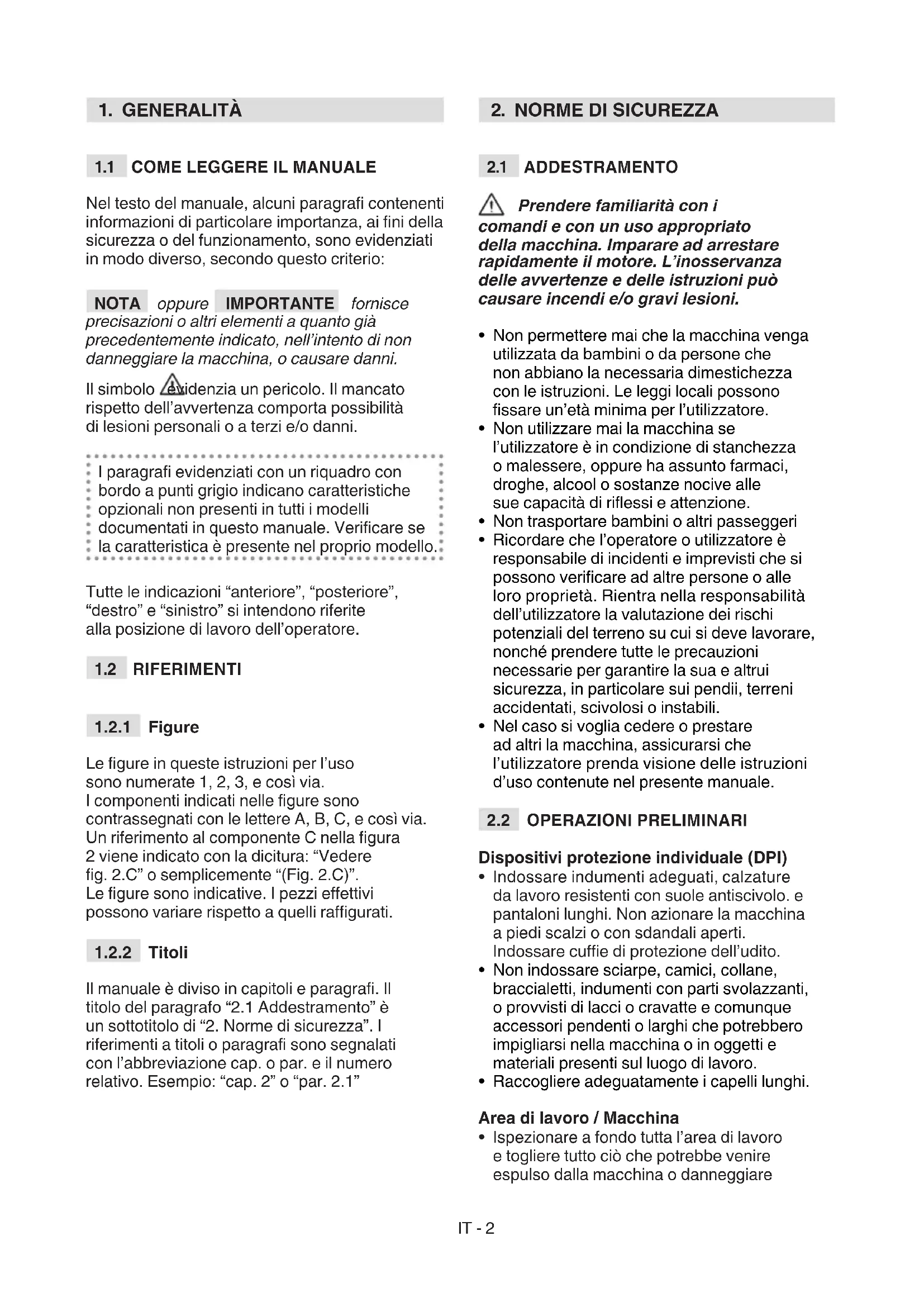 Il manuale è diviso in capitoli e paragra. Il titolo del paragrafo “2.1 Addestramento” è un sottotitolo di “2. Norme di sicurezza”. I riferimenti a titoli o paragra sono segnalati con l’abbreviazione cap. o par. e il numero relativo. Esempio: “cap. 2” o “par. 2.1”