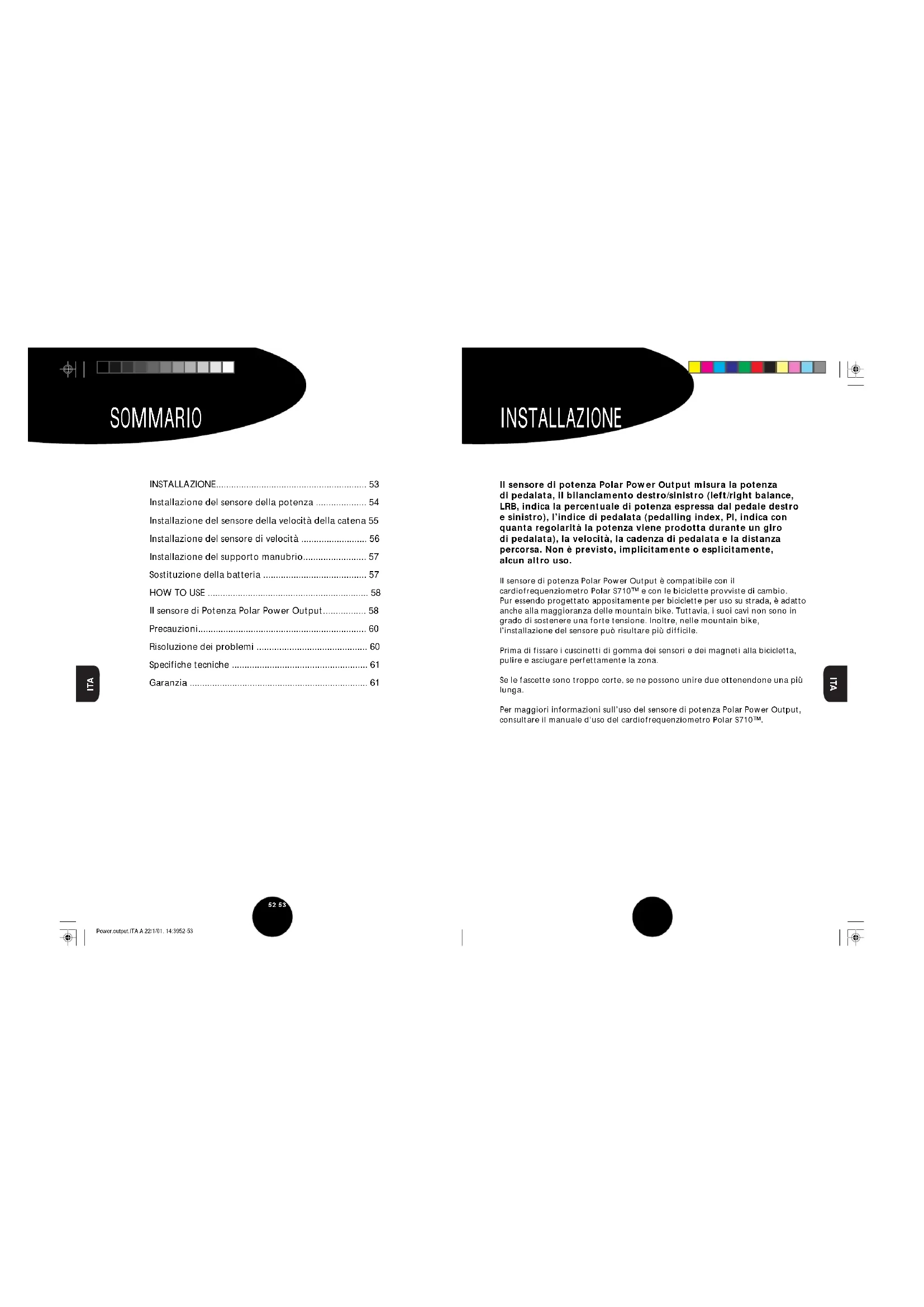 - Garanzia Il sensore di potenza Polar Power Output misura la potenza di pedalata, il bilanciamento destro/sinistro (left/right balance, LRB, indica la percentuale di potenza espressa dal pedale destro e sinistro), l’indice di pedalata (pedalling index, PI, indica con quanta regolarità la potenza viene prodotta durante un giro di pedalata), la velocità, la cadenza di pedalata e la distanza percorsa. Non è previsto, implicitamente o esplicitamente, alcun altro uso. Il sensore di potenza Polar Power Output è compatibile con il cardiofrequenziometro Polar S710™ e con le biciclette provviste di cambio. Pur essendo progettato appositamente per biciclette per uso su strada, è adatto anche alla maggioranza delle mountain bike. Tuttavia, i suoi cavi non sono in grado di sostenere una forte tensione. Inoltre, nelle mountain bike, l’installazione del sensore può risultare più difficile. Prima di fissare i cuscinetti di gomma dei sensori e dei magneti alla bicicletta, pulire e asciugare perfettamente la zona. Se le fascette sono troppo corte, se ne possono unire due ottenendone una più lunga. Per maggiori informazioni sull’uso del sensore di potenza Polar Power Output, consultare il manuale d’uso del cardiofrequenziometro Polar S710™. SOMMARIO Power.output.ITA A 22/1/01, 14:3952-5354 55 ITA ITA p. 61