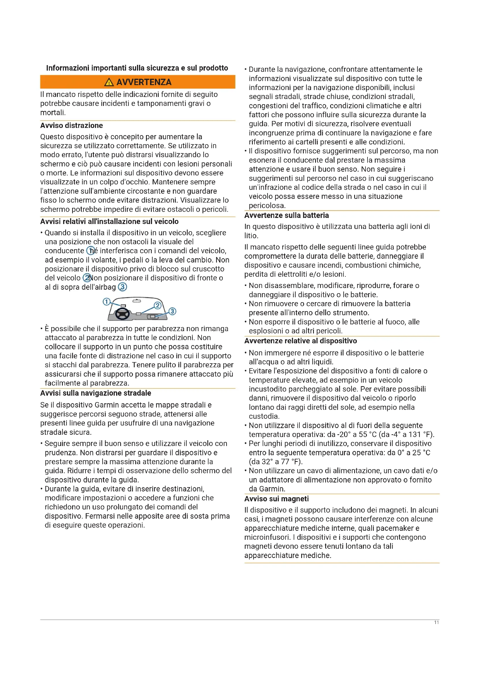 - Non utilizzare un cavo di alimentazione, un cavo dati e/o un adattatore di alimentazione non approvato o fornito da Garmin. Avviso sui magneti Il dispositivo e il supporto includono dei magneti. In alcuni casi, i magneti possono causare interferenze con alcune apparecchiature mediche interne, quali pacemaker e microinfusori. I dispositivi e i supporti che contengono magneti devono essere tenuti lontano da tali apparecchiature mediche. 11AVVISO Il mancato rispetto degli avvisi forniti di seguito potrebbe causare danni alla persona o alle proprietà oppure incidere in modo negativo sulla funzionalità del dispositivo. Avvisi sulla batteria