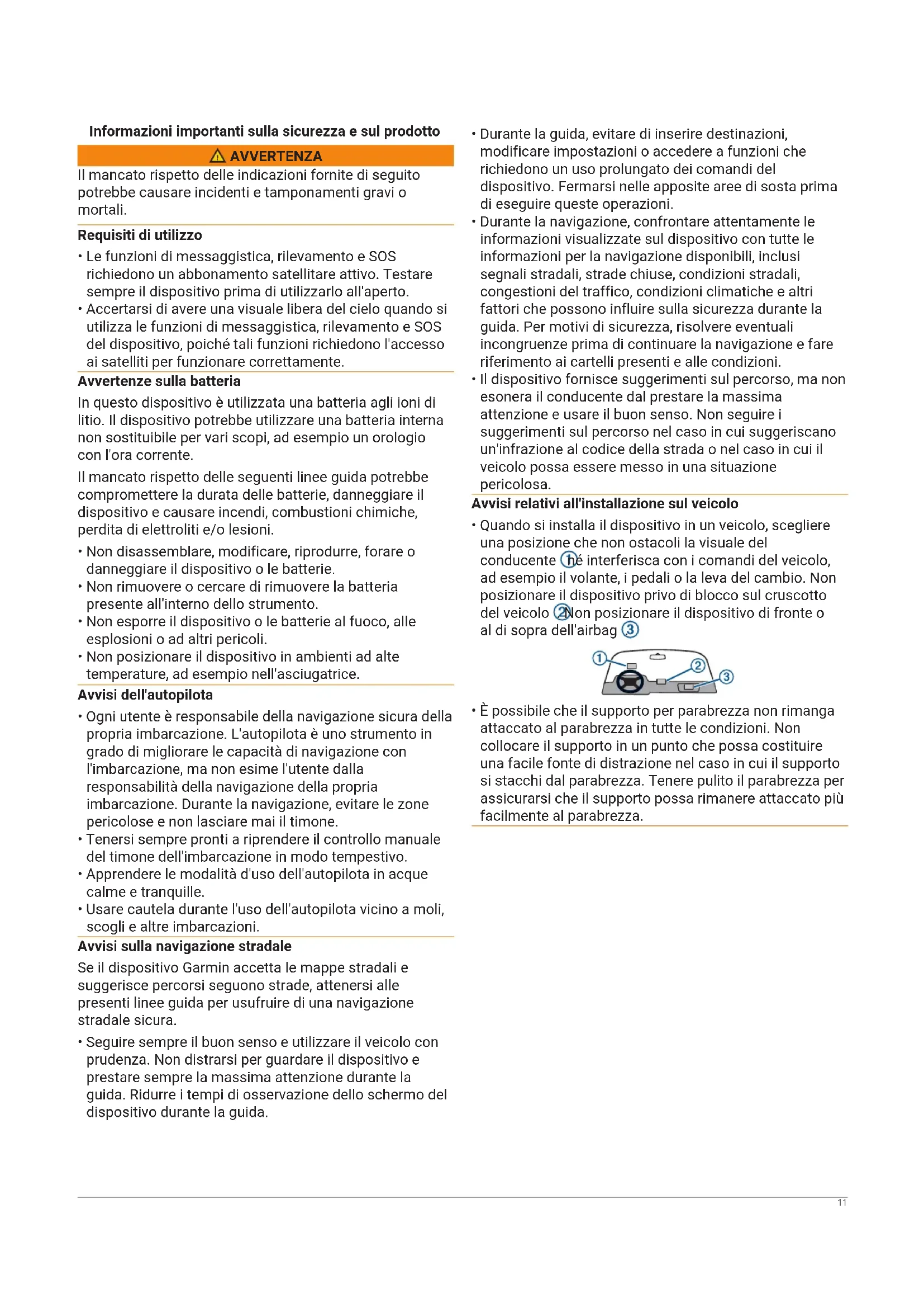 - Usare cautela durante l'uso dell'autopilota vicino a moli, scogli e altre imbarcazioni. Avvisi sulla navigazione stradale Se il dispositivo Garmin accetta le mappe stradali e suggerisce percorsi seguono strade, attenersi alle presenti linee guida per usufruire di una navigazione stradale sicura.