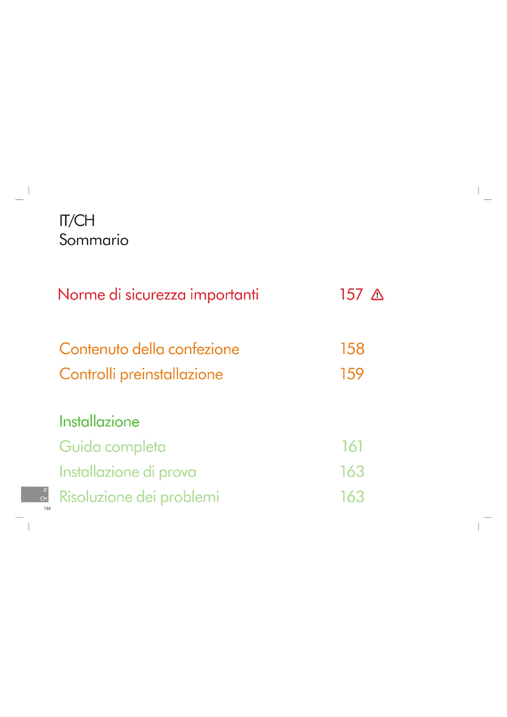 Norme di sicurezza importanti Contenuto della confezione Controlli preinstallazione Installazione Guida completa Installazione di prova Risoluzione dei problemi IT/CH Sommario