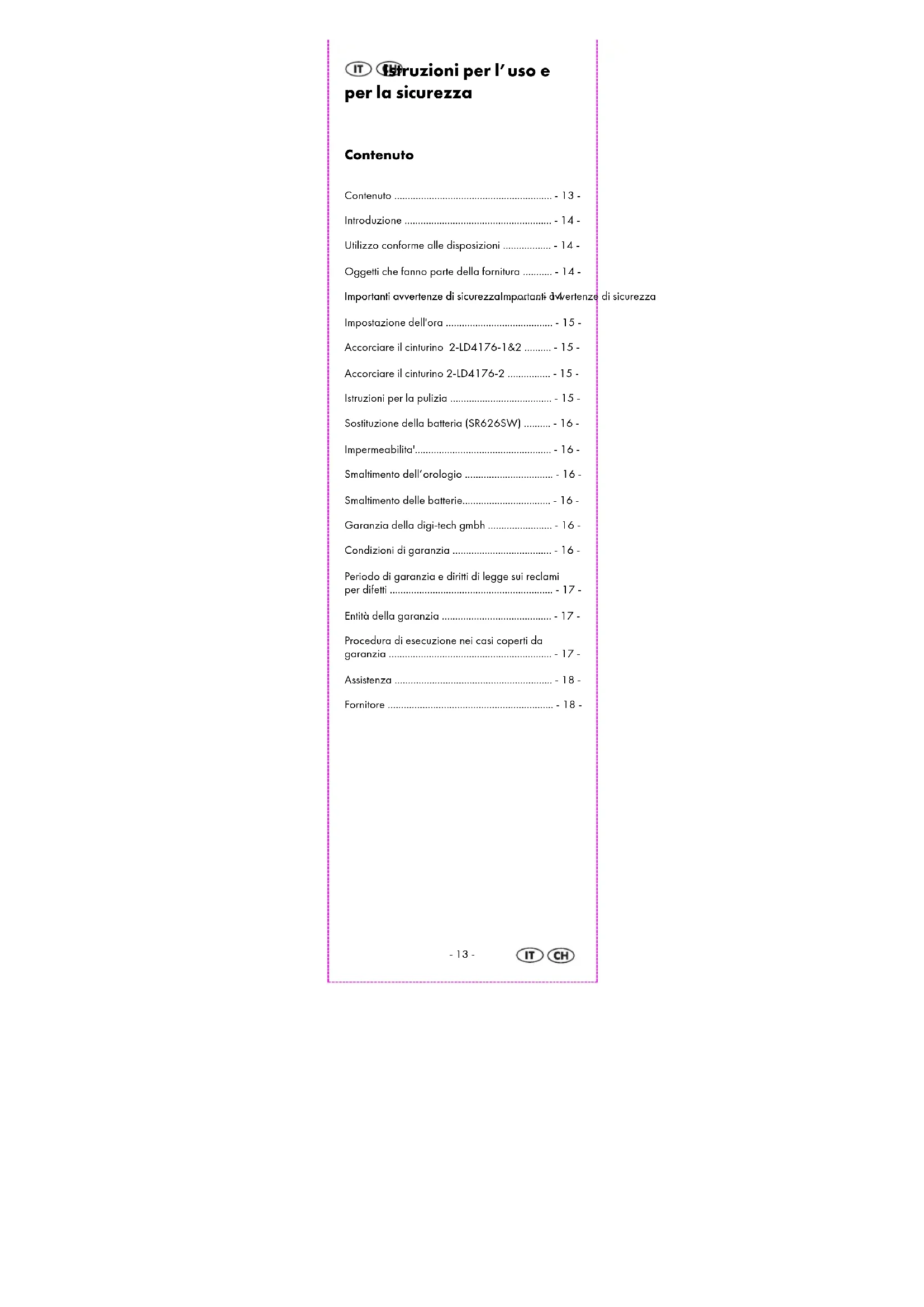 Smaltimento dell’orologio Questo orologio non può essere smaltito nei normali rifiuti domestici. Smaltite l’orologio tramite un impianto omologato per lo smaltimento o tramite la struttura comunale preposta allo smaltimento. Rispettare le disposizioni in merito, in vigore al momento. In caso di dubbio, rivolgersi alla Azienda locale di Servizi pubblici di smaltimento. Smaltimento delle batterie Smaltire correttamente le batterie nei recipienti in commercio, a questo scopo appositamente predisposti. Le batterie non devono essere gettate nei rifiuti domestici. Smaltire le batterie attraverso un’impresa di smaltimento approvata oppure tramite i servizi di smaltimento comunali. Rispettare le disposizioni in merito, in vigore al momento. In caso di dubbio, rivolgersi alla Azienda locale di Servizi pubblici di smaltimento. Garanzia della digi-tech gmbh Questo orologio prevede una garanzia di 3 anni dall‘acquisto. In caso di difetti di questo orologio vi spettano i diritti legali nei confronti del venditore del prodotto. Questi diritti di legge non vengono ridotti dalla nostra garanzia descritta al punto seguente. Condizioni di garanzia Il periodo di garanzia decorre dalla data di acquisto. Conservare con cura lo scontrino originale di cassa. Questa documentazione è necessaria per comprovare l’acquisto. Se nei tre anni dall’acquisto di questo orologio subentra un difetto di materiale o di fabbricazione, l’orologio verrà riparato gratuitamente o sostituito a nostra discrezione. Questa prestazione di garanzia prevede che all’interno del termine di tre anni presentiate l’orologio difettoso e la ricevuta di acquisto (scontrino) e che descriviate brevemente la tipologia del difetto e quando è stato rilevato. Se il-