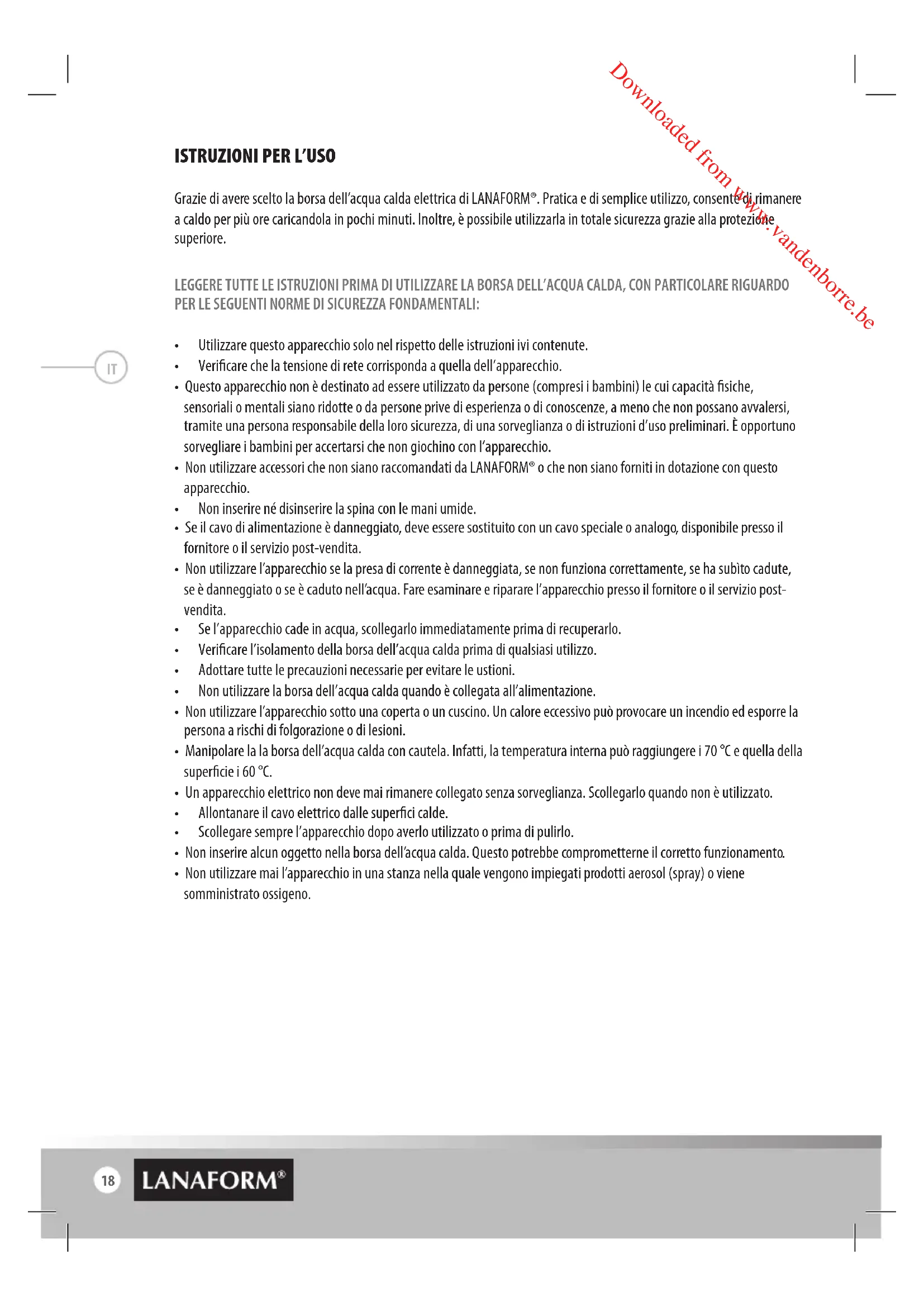 Grazie di avere scelto la borsa dell’acqua calda elettrica di LANAFORM®. Pratica e di semplice utilizzo, consente di rimanere a caldo per più ore caricandola in pochi minuti. Inoltre, è possibile utilizzarla in totale sicurezza grazie alla protezione superiore. LEGGERE TUTTE LE ISTRUZIONI PRIMA DI UTILIZZARE LA BORSA DELL’ACQUA CALDA, CON PARTICOLARE RIGUARDO PER LE SEGUENTI NORME DI SICUREZZA FONDAMENTALI: