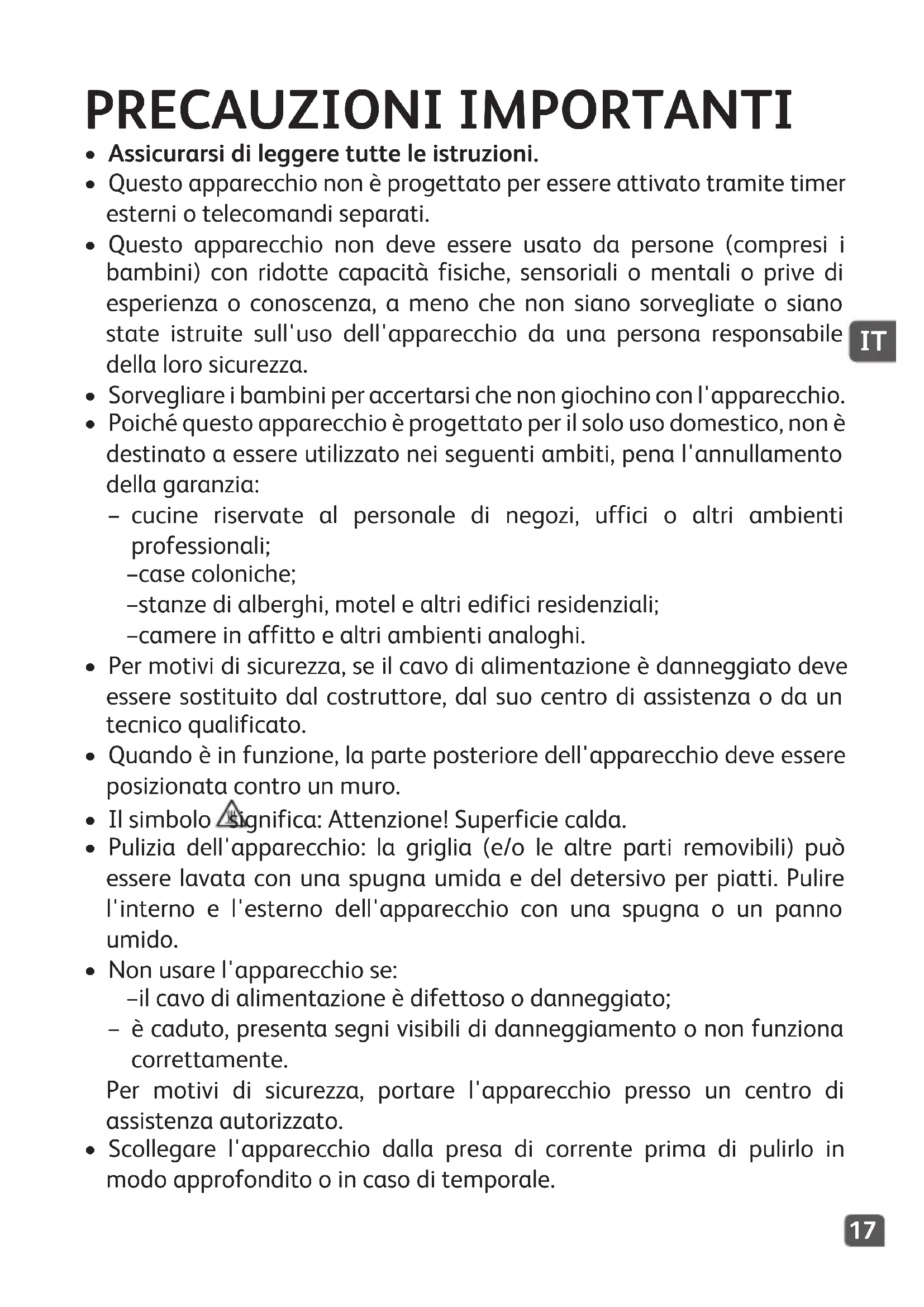 - Non usare prodotti detergenti aggressivi (in particolare a base di bicarbonato), spugne in metallo o pagliette. Questo prodotto è destinato al solo uso domestico. In caso di applicazione commerciale, uso inappropriato o mancato rispetto delle istruzioni, il fabbricante declina ogni responsabilità e la garanzia verrà annullata.20