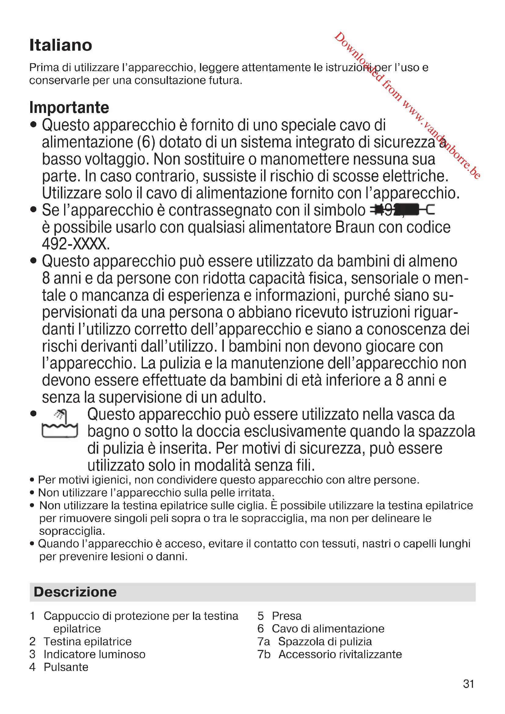 Questo apparecchio è fornito di uno speciale cavo di alimentazione (6) dotato di un sistema integrato di sicurezza a basso voltaggio. Non sostituire o manomettere nessuna sua parte. In caso contrario, sussiste il rischio di scosse elettriche. Utilizzare solo il cavo di alimentazione fornito con l’apparecchio.