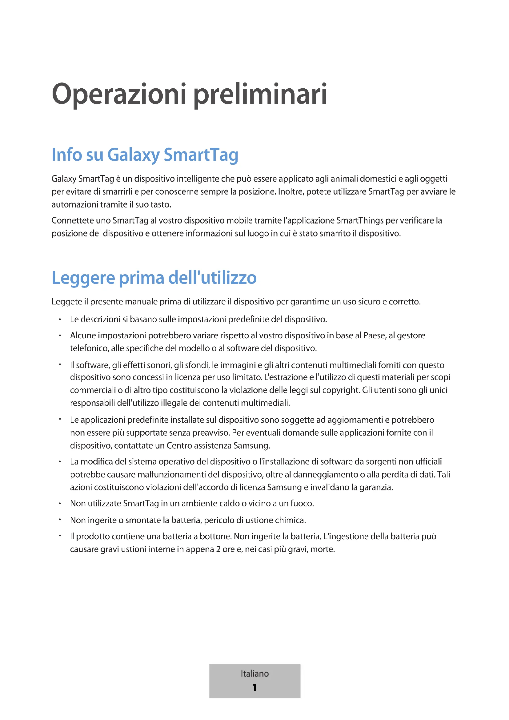 Operazioni preliminari Info su Galaxy SmartTag Galaxy SmartTag è un dispositivo intelligente che può essere applicato agli animali domestici e agli oggetti per evitare di smarrirli e per conoscerne sempre la posizione. Inoltre, potete utilizzare SmartTag per avviare le automazioni tramite il suo tasto. Connettete uno SmartTag al vostro dispositivo mobile tramite l'applicazione SmartThings per verificare la posizione del dispositivo e ottenere informazioni sul luogo in cui è stato smarrito il dispositivo. Leggere prima dell'utilizzo Leggete il presente manuale prima di utilizzare il dispositivo per garantirne un uso sicuro e corretto.