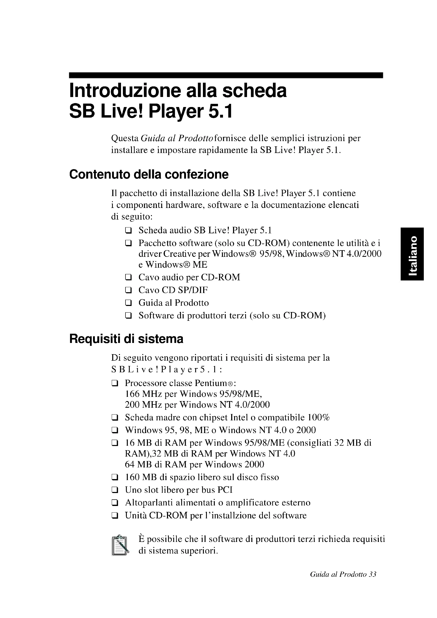 Una volta ricevuto il componente difettoso, la Creative Labs elaborerà la richiesta dell'utente e provvederà alla restituzione del componente.Guida al Prodotto 41 Italiano La Creative potrà sostituire o riparare il prodotto con parti nuove o rigenerate e i componenti difettosi diventeranno di proprietà dell'azienda. Il periodo di garanzia per l’articolo riparato o sostituito è di 90 giorni a partire dalla data di spedizione da parte della Creative, o pari alla restante durata della garanzia dell'articolo originale. Per evitare l'addebito di tariffe per la spedizione del prodotto alla Creative Labs da paesi non appartenenti all'Unione Europea, è necessario compilare l'apposita documentazione doganale prima di effettuare la spedizione (considerare un periodo di circa 30 giorni). Garanzia limitata Creative Labs (Ireland) Limited (“Creative”) garantisce esclusivamente all’utente che ha acquisito il prodotto (“Cliente”) che il prodotto hardware è privo di difetti dovuti a materiali o a lavorazione per un periodo di due anni dalla data di acquisto, ovvero per il periodo espressamente specificato da Creative o richiesto dalle leggi vigenti (“Periodo di garanzia”). Unica responsabilità di Creative, e unico rimedio per il cliente, sarà la riparazione o la sostituzione (con un modello identico o similare), a esclusiva discrezione di Creative, dell’hardware o dei componenti acclusi che non rispondono ai termini della "Garanzia limitata" sopra descritta e che vengono restituiti a Creative o a un rivenditore/distributore autorizzato durante il Periodo di garanzia insieme ad una copia della prova d’acquisto. Esclusione di altre garanzie Nella misura massima prevista dalla legge applicabile, Creative non riconosce alcun’altra garanzia e condizione, sia esplicite che implicite, incluse, tra l’altro, le garanzie implicite di commerciabilità o di idoneità per un fine particolare, in relazione all'uso di questo prodotto. Creative, inoltre, non riconosce alcun obbligo al supporto del prodotto in tutti gli ambienti operativi - ad esempio non garantisce l’interoperabilità con le future versioni di software o hardware. In nessun caso Creative o i suoi rappresentanti autorizzati saranno42 SB Live! Player 5.1 responsabili per eventuali danni indiretti, incidentali, speciali o consequenziali, o danni per perdita di profitti, di risparmi o di dati derivanti o connessi all'utilizzo di questo prodotto, anche nel caso in cui Creative o i suoi rappresentanti autorizzati siano stati informati della possibilità del verificarsi di tali danni. In particolare, questa garanzia non copre il mancato funzionamento del prodotto dovuto a incidenti, uso illecito o non corretto, alterazioni (non eseguite da personale di Creative o dei suoi rappresentanti autorizzati), umidità, ambienti corrosivi, spedizioni, picchi di tensione o condizioni di lavoro anomale. Questa garanzia non copre danni dovuti a normale usura. Il Cliente è esplicitamente invitato ad eseguire una copia di backup del software fornito con i prodotti Creative, ad esclusivo scopo di sicurezza. Questa garanzia trasferisce al Cliente specifici diritti legali. È possibile che siano riconosciuti diritti aggiuntivi per il Cliente a seconda del Paese di acquisto del prodotto. Alcune limitazioni previste in questa garanzia potrebbero non essere riconosciute dalle leggi vigenti in alcuni Paesi e quindi potrebbero non applicarsi al Cliente.Guía del producto 43 Español Bienvenido a SB Live! Player 5.1 Esta Guía del producto le proporciona instrucciones sencillas que describen cómo instalar y configurar rápidamente la tarjeta SB Live! Player 5.1 en el ordenador. Contenido del lote El lote de instalación de la tarjeta SB Live! Player 5.1 contiene los siguientes elementos de hardware, software y documentación:
