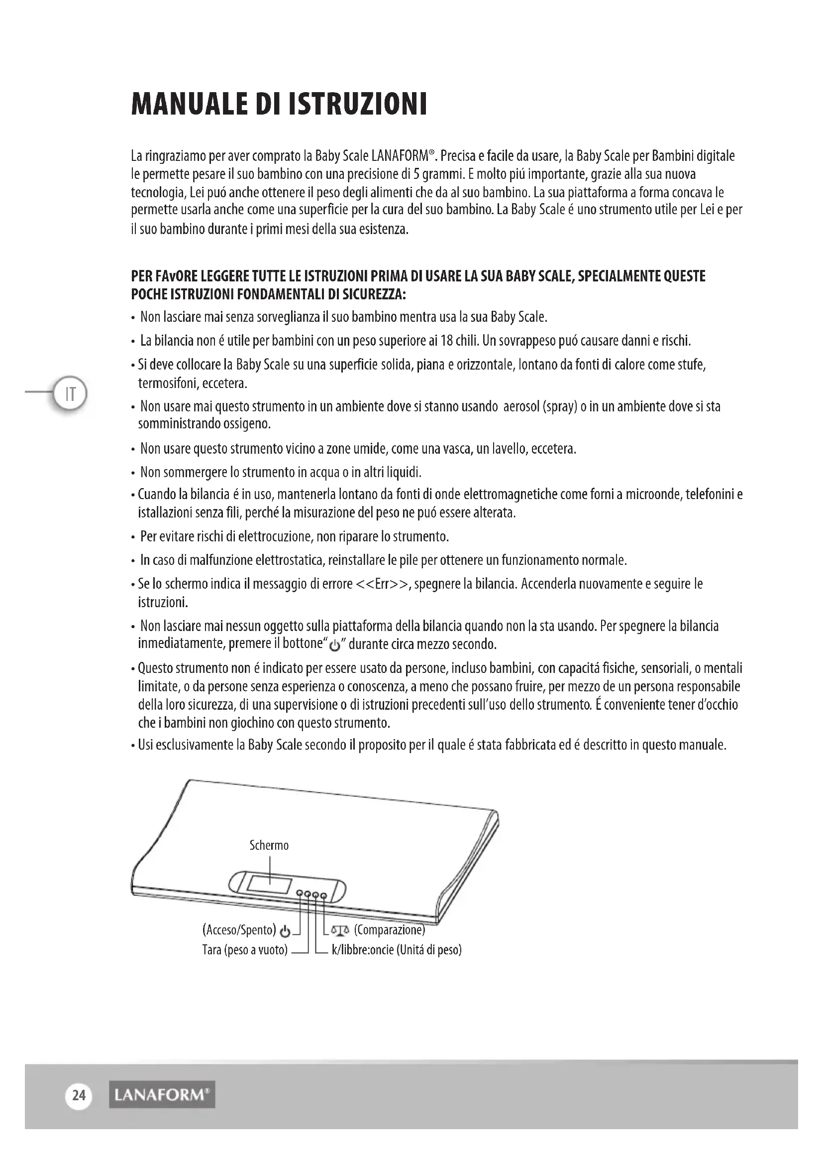 Scarica le istruzioni per il tuo Bilance in formato PDF gratuitamente! Trova il tuo manuale LA090324 - LANAFORM e riprendi in mano il tuo dispositivo elettronico. In questa pagina sono pubblicati tutti i documenti necessari per l'utilizzo del tuo dispositivo. LA090324 del marchio LANAFORM.