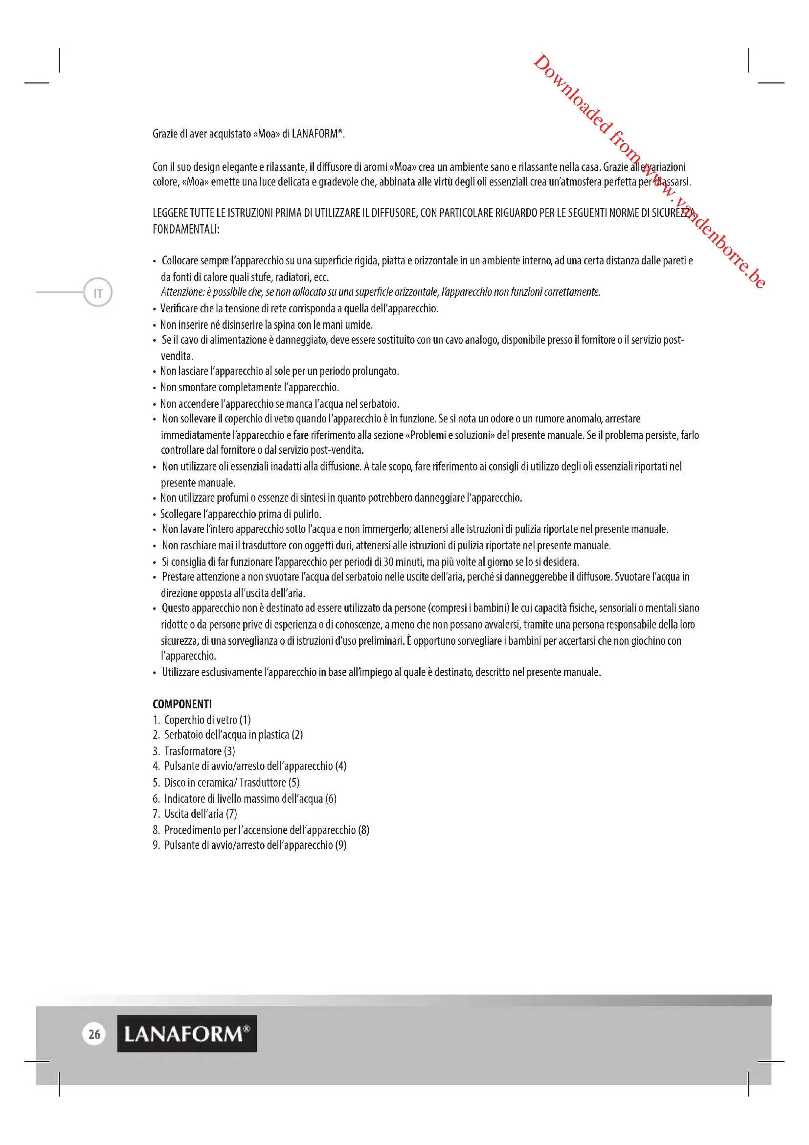 Downloaded from www.vandenborre.be26 Grazie di aver acquistato «Moa» di LANAFORM®. Con il suo design elegante e rilassante, il diusore di aromi «Moa» crea un ambiente sano e rilassante nella casa. Grazie alle variazioni colore, «Moa» emette una luce delicata e gradevole che, abbinata alle virtù degli oli essenziali crea un’atmosfera perfetta per rilassarsi. LEGGERE TUTTE LE ISTRUZIONI PRIMA DI UTILIZZARE IL DIFFUSORE, CON PARTICOLARE RIGUARDO PER LE SEGUENTI NORME DI SICUREZZA FONDAMENTALI: