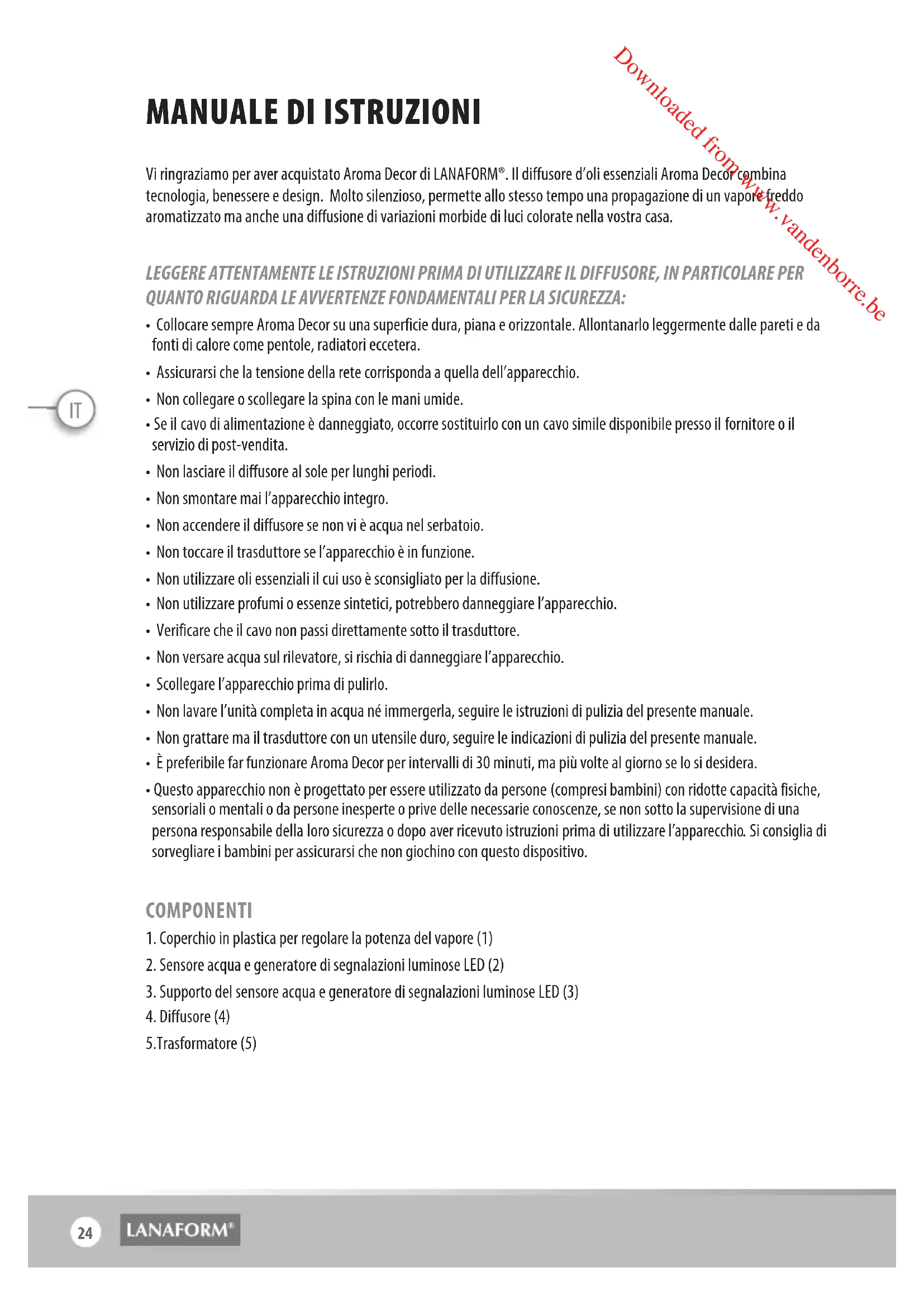 Downloaded from www.vandenborre.beIT - Vigilare che i bambini e i minorenni non giochino con l’apparecchio, né lo utilizzino. - Sono sufficienti solo alcune gocce (3-4 massimo) di oli essenziali per garantire un buon funzionamento dell’apparecchio e la diffusione dell’aroma. Un utilizzo eccessivo degli oli essenziali potrebbe danneggiare l’apparecchio. - Prima di aggiungere le gocce di oli essenziali, versare l’acqua nel serbatoio. - Lanaform ® declina ogni responsabilità in caso di danno accidentale derivante da qualsiasi utilizzo non previsto dal presente manuale d’uso.