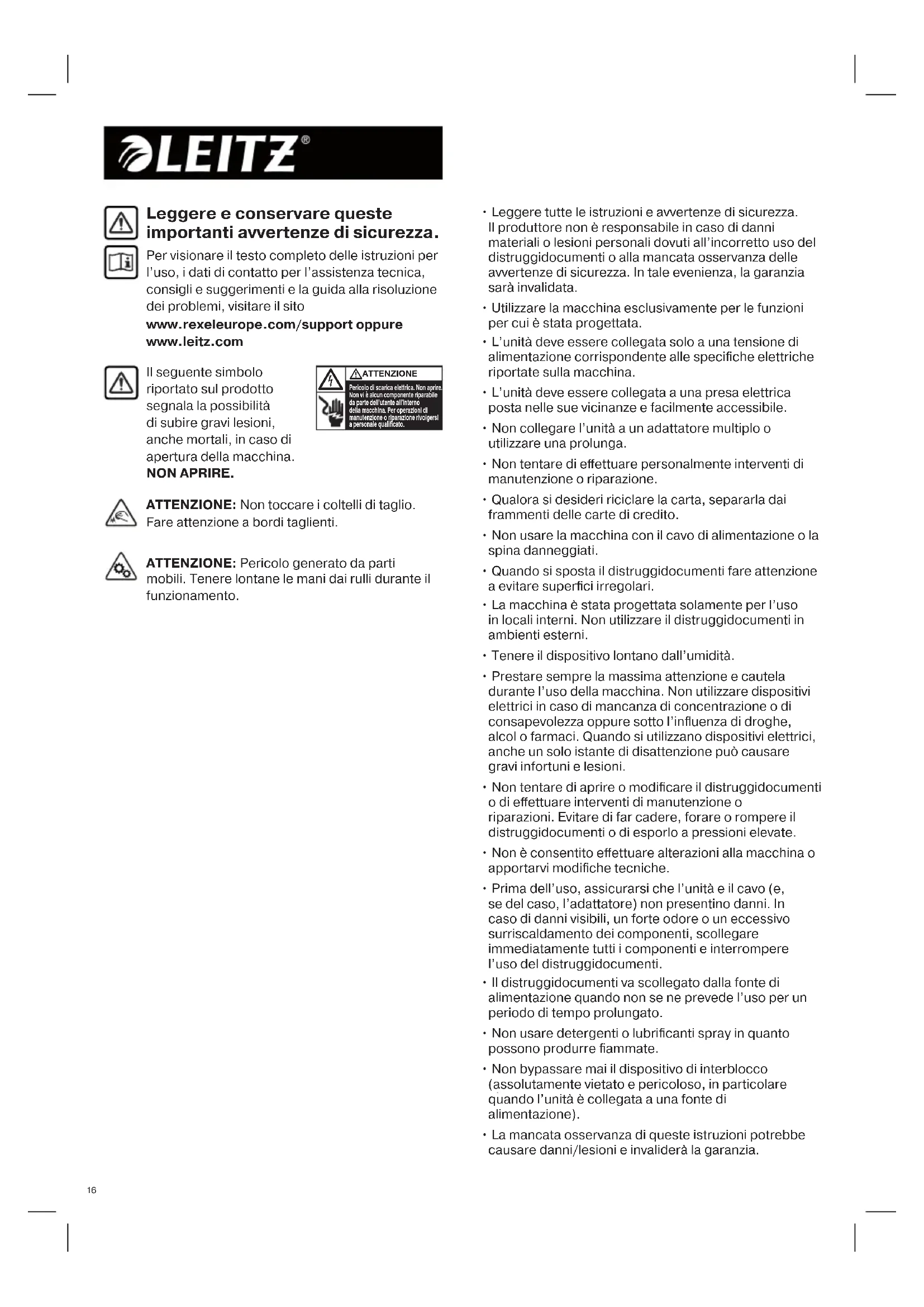 - La mancata osservanza di queste istruzioni potrebbe causare danni/lesioni e invaliderà la garanzia. Leggere e conservare queste importanti avvertenze di sicurezza. Per visionare il testo completo delle istruzioni per l’uso, i dati di contatto per l’assistenza tecnica, consigli e suggerimenti e la guida alla risoluzione dei problemi, visitare il sito www.rexeleurope.com/support oppure www.leitz.com ATTENZIONE: Non toccare i coltelli di taglio. Fare attenzione a bordi taglienti. ATTENZIONE: Pericolo generato da parti mobili. Tenere lontane le mani dai rulli durante il funzionamento.1717171717 Tenere lontano catenine e braccialetti Niente carte di credito Tenere lontano cravatte e abiti larghi Simboli di avvertimento Tenere lontano capelli lunghi Non infilare le mani nell’imboccatura Simboli di avvertimento Capacità di taglio Niente CD Niente punti extra-lunghi di oltre 26 mm Avvertenza: parti mobili Questa macchina non è destinata all’utilizzo da parte di bambini Non utilizzare bombolette spray. Non usare detergenti o lubrificanti spray in quanto possono produrre fiammate. Comandi e indicatori Accessori Utilizzare solo accessori Leitz Fogli di lubrificazione - 8007 00 00 Icona Tipo Modello Interruttore a cursore / indicatore e funzione Tasti di comando 11,12,13 Tasto avviamento automatico e modalità standby (unica pressione) Reverse (portare l’interruttore nella posizione modalità reverse) Avanti (portare l’interruttore nella posizione modalità avanti) Indicatore di surriscaldamento (far rareddare il distruggidocumenti) Indicatore di sovraccarico / Indicatore di inceppamento (ridurre il numero di fogli / eliminare l’inceppamento) Indicatore di cestino pieno (aprire lo sportello o sollevare la testa del distruggidocumenti e svuotare il cestino) Indicatore di sportello aperto o di testa del distruggidocumenti rimossa (chiudere bene lo sportello)18 CD e DVD Non utilizzare bombolette spray No Oil, solo fogli di olio Supporti che il dispositivo è in grado di distruggere È in grado di distruggere i tipi di documenti elencati di seguito: