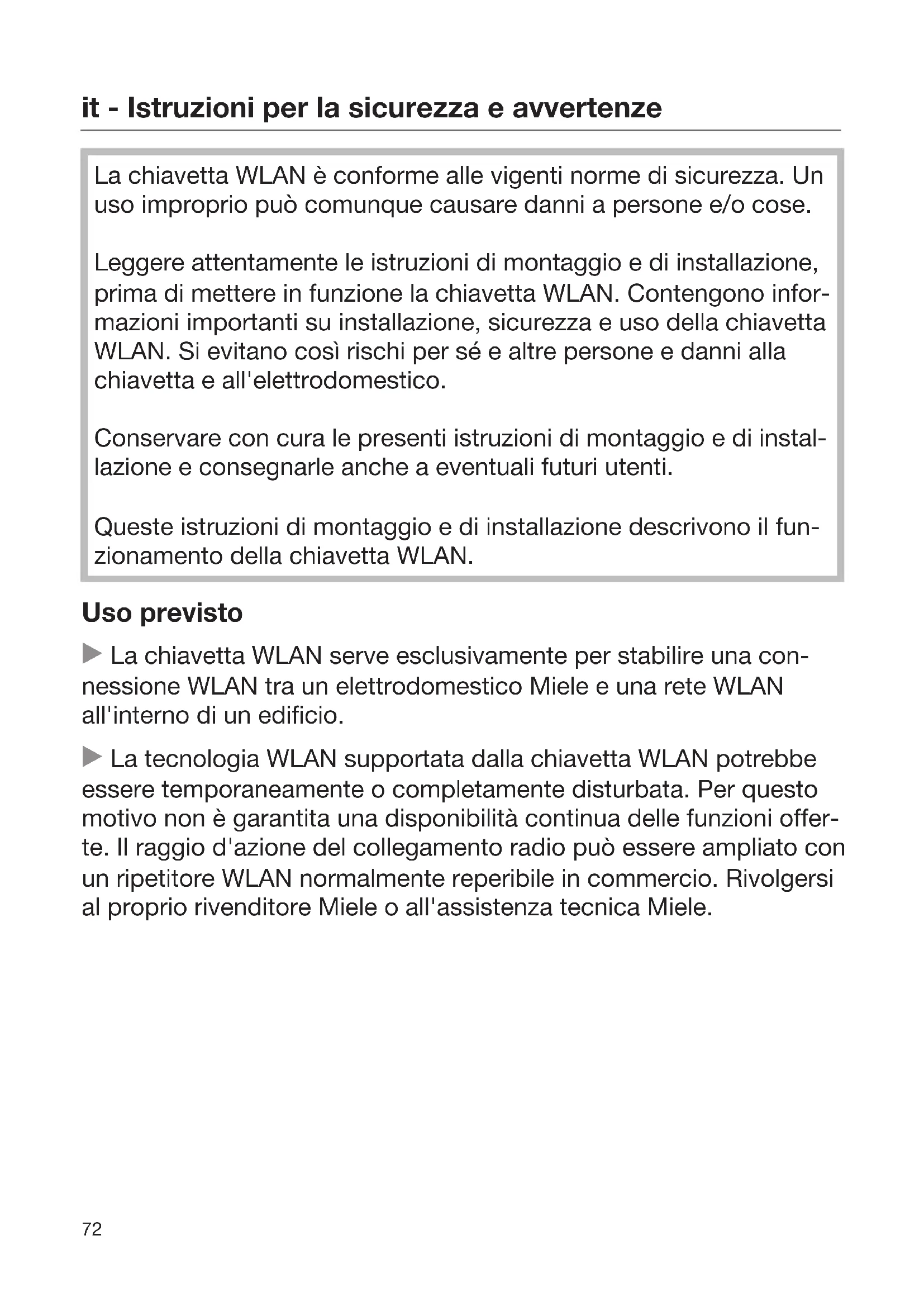 La chiavetta WLAN è conforme alle vigenti norme di sicurezza. Un uso improprio può comunque causare danni a persone e/o cose. Leggere attentamente le istruzioni di montaggio e di installazione, prima di mettere in funzione la chiavetta WLAN. Contengono infor- mazioni importanti su installazione, sicurezza e uso della chiavetta WLAN. Si evitano così rischi per sé e altre persone e danni alla chiavetta e all'elettrodomestico. Conservare con cura le presenti istruzioni di montaggio e di instal- lazione e consegnarle anche a eventuali futuri utenti. Queste istruzioni di montaggio e di installazione descrivono il fun- zionamento della chiavetta WLAN. Uso previsto La chiavetta WLAN serve esclusivamente per stabilire una con- nessione WLAN tra un elettrodomestico Miele e una rete WLAN all'interno di un edificio. La tecnologia WLAN supportata dalla chiavetta WLAN potrebbe essere temporaneamente o completamente disturbata. Per questo motivo non è garantita una disponibilità continua delle funzioni offer- te. Il raggio d'azione del collegamento radio può essere ampliato con un ripetitore WLAN normalmente reperibile in commercio. Rivolgersi al proprio rivenditore Miele o all'assistenza tecnica Miele.it - Istruzioni per la sicurezza e avvertenze