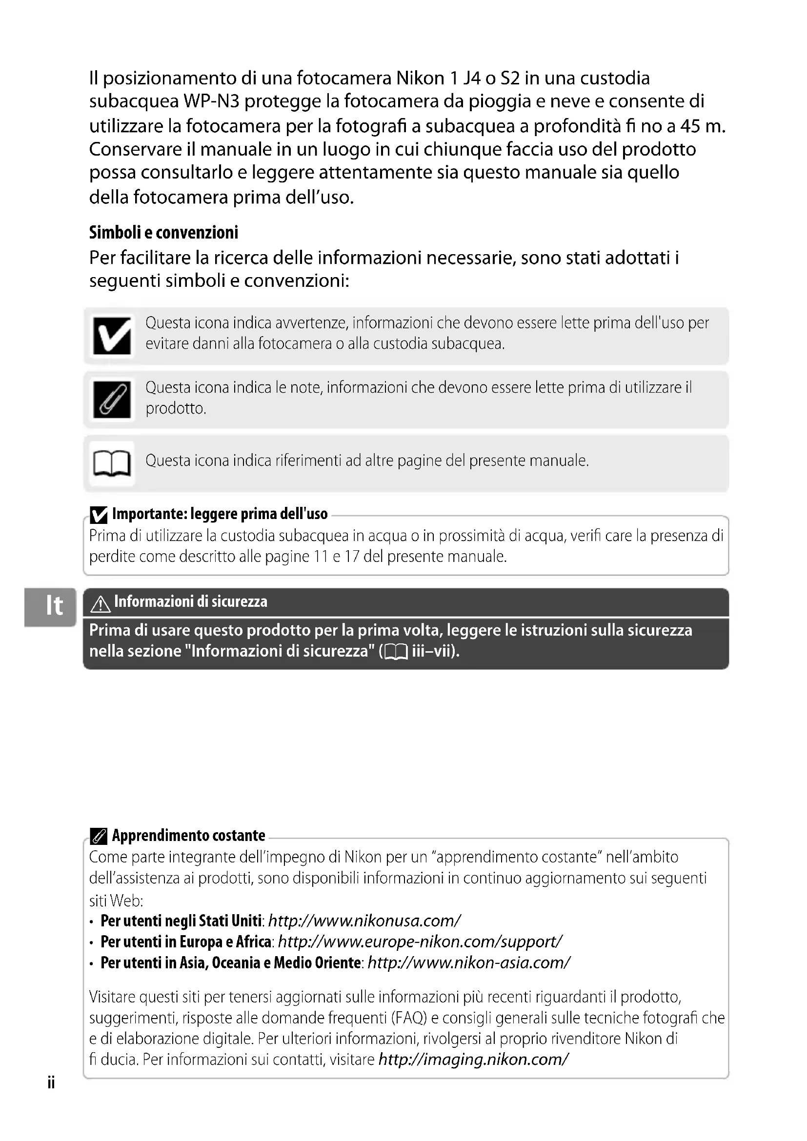 Il posizionamento di una fotocamera Nikon 1 J4 o S2 in una custodia subacquea WP-N3 protegge la fotocamera da pioggia e neve e consente di utilizzare la fotocamera per la fotogra a subacquea a profondità no a 45 m. Conservare il manuale in un luogo in cui chiunque faccia uso del prodotto possa consultarlo e leggere attentamente sia questo manuale sia quello della fotocamera prima dell’uso. Simboli e convenzioni Per facilitare la ricerca delle informazioni necessarie, sono stati adottati i seguenti simboli e convenzioni: Questa icona indica avvertenze, informazioni che devono essere lette prima dell'uso per evitare danni alla fotocamera o alla custodia subacquea.Questa icona indica le note, informazioni che devono essere lette prima di utilizzare il prodotto.Questa icona indica riferimenti ad altre pagine del presente manuale. Importante: leggere prima dell'usoPrima di utilizzare la custodia subacquea in acqua o in prossimità di acqua, verifi care la presenza di perdite come descritto alle pagine 11 e 17 del presente manuale. Informazioni di sicurezzaPrima di usare questo prodotto per la prima volta, leggere le istruzioni sulla sicurezza nella sezione "Informazioni di sicurezza" ( iii–vii). Apprendimento costanteCome parte integrante dell’impegno di Nikon per un “apprendimento costante” nell’ambito dell’assistenza ai prodotti, sono disponibili informazioni in continuo aggiornamento sui seguenti siti Web: