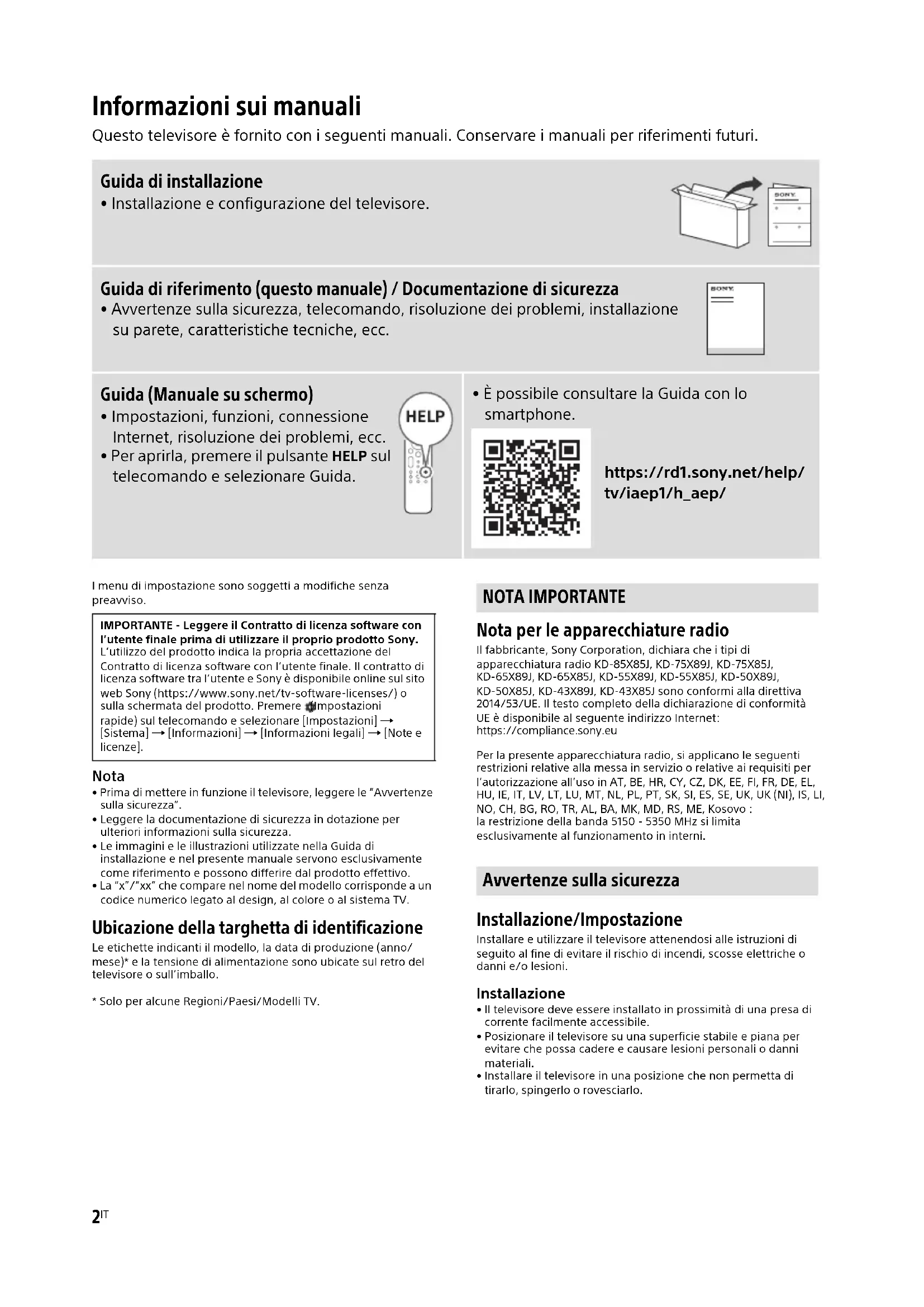 - È possibile consultare la Guida con lo smartphone. https://rd1.sony.net/help/ tv/iaep1/h_aep/ IMPORTANTE - Leggere il Contratto di licenza software con l’utente finale prima di utilizzare il proprio prodotto Sony. L’utilizzo del prodotto indica la propria accettazione del Contratto di licenza software con l’utente finale. Il contratto di licenza software tra l’utente e Sony è disponibile online sul sito web Sony (https://www.sony.net/tv-software-licenses/) o sulla schermata del prodotto. Premere (Impostazioni rapide) sul telecomando e selezionare [Impostazioni] [Sistema] [Informazioni] [Informazioni legali] [Note e licenze]. NOTA IMPORTANTE Avvertenze sulla sicurezza3