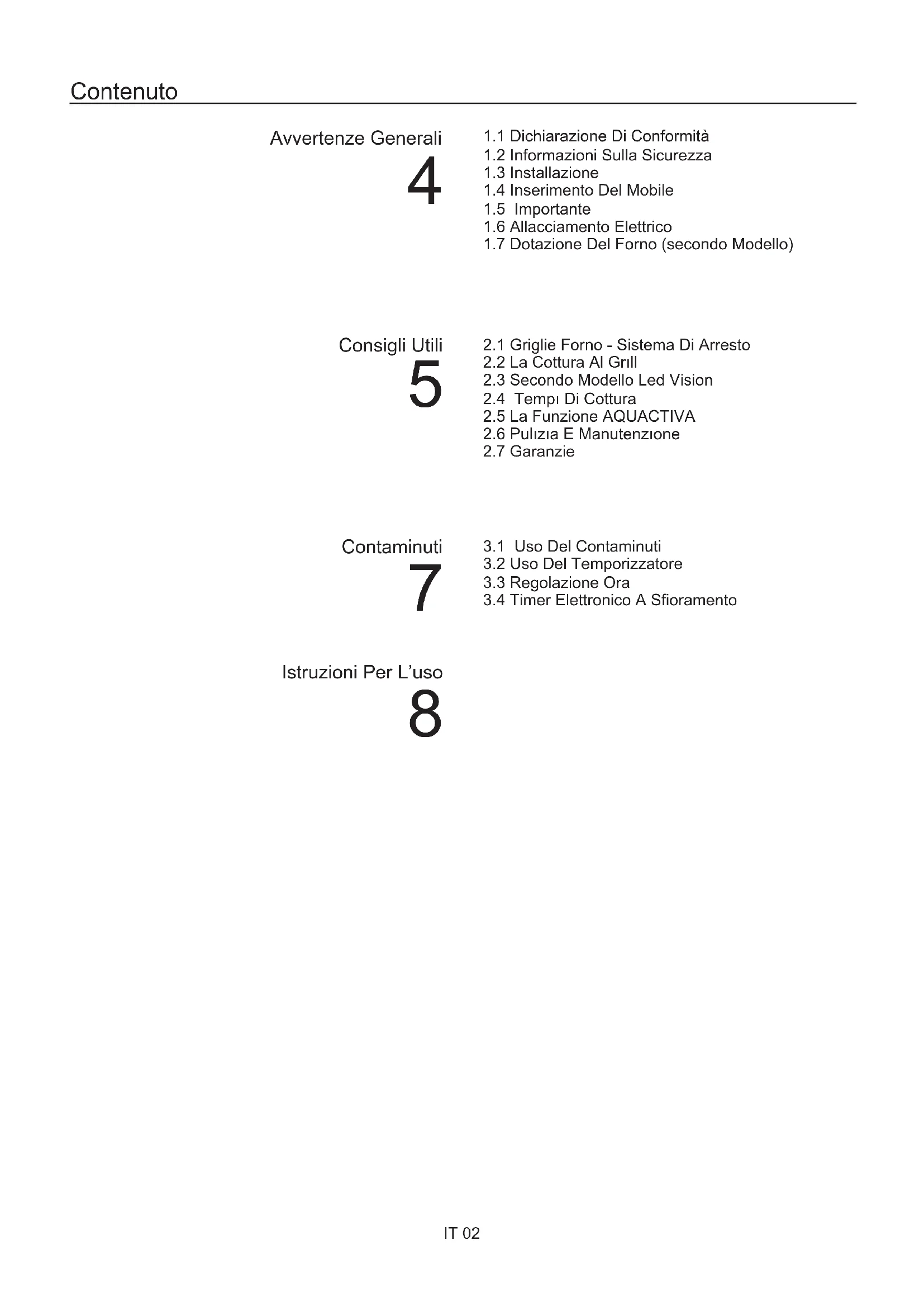 Per la pulizia dei vetri della porta del forno non utilizzare materiali abrasivi raschietti o oggetti che possono graffiare la superficie del vetro. Pulire le superfici in acciaio inox e smaltate con acqua tiepida e sapone, oppure con appositi prodotti in commercio, evitando assolutamente l’uso di polveri abrasive che danneggerebbero le superfici e le parti estetiche. La pulizia del forno è molto importante e deve essere effettuata ogni volta che questo viene usato. Infatti, sulle pareti si depositano grassi sciolti durante la cottura che potrebbero, alla successiva accensione, produrre odori sgradevoli che nuocerebbero al buon esito della cottura. Per la pulizia usare acqua calda e detersivo, sciacquando accuratamente. Per eliminare questo fastidioso intervento, su tutti i modelli possono essere inseriti pannelli autopulenti, offerti come accessori opzionali: vedere apposito paragrafo«FORNO AUTOPULENTE CATALITICO » Usare detersivi e pagliette d’acciaio per le griglie inox. La pulizia delle superfici in cristallo temperato deve essere eseguita quando le superfici sono fredde. Eventuali rotture dovute alla non osservanza di questa regola elementare non rientrano nei termini di garanzia. La lampada forno può essere sostituita disinserendo elettricamente l’apparecchio e svitando l’ampolla che la racchiude, sostituendo la lampada non funzionante con una analoga resistente alle alte temperature. IT 06 Il prodotto è garantito, oltre che ai sensi di legge, alle condizioni e nei termini riportati sul certificato di garanzia convenzionale inserito nel prodotto. Il certificato dovrà essere conservato e mostrato al nostro Centro di Assistenza Tecnica Autorizzato, in caso di necessità, insieme allo scontrino comprovante l'acquisto dell'elettrodomestico. Puoi consultare le condizioni di garanzia anche sul nostro sito internet. Per ottenere assistenza compila l'apposito form on-line oppure contattaci al numero che trovi indicato nella pagina di assistenza del nostro sito internet.Per selezionare il tempo prescelto, ruotare la manopola di un giro completo, quindi ritornare con l’indice nella posizione corrispondente al tempo desiderato. Allo scadere del tempo, entrerà in azione la suoneria per alcuni secondi.Con questo meccanismo è possibile programmare la durata espressa in minuti della cottura e quindi lo spegnimento automatico del forno al termine del tempo desiderato (max. 120 minuti).Allo scadere del tempo prescelto, la manopola raggiungerà la posizione di suoneria O in corrispondenza della qua le i l forno s i spegne automaticamente.Il forno può essere acceso solo impostando un tempo di cottura o girando la manopola in posizione .