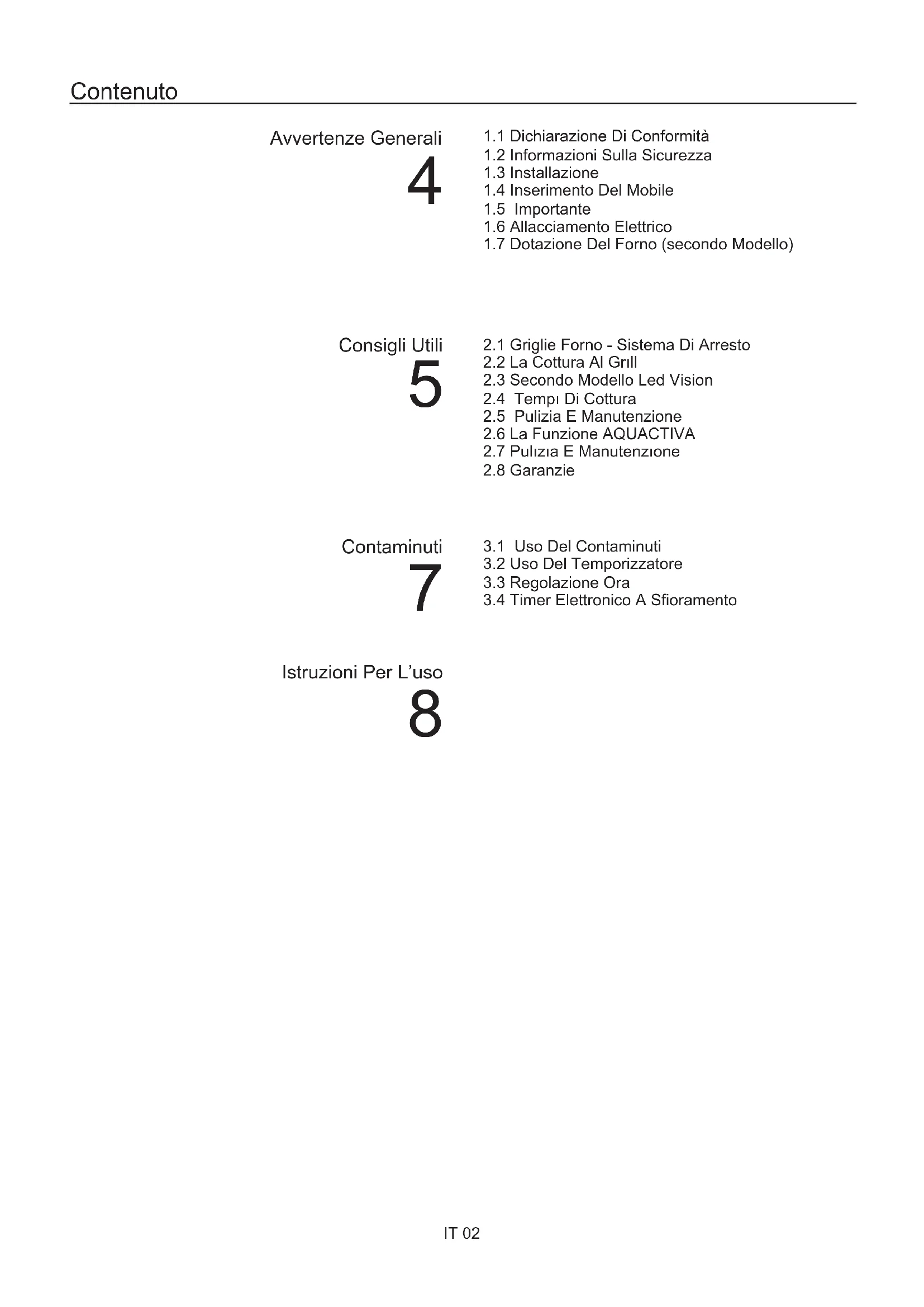 IT 05 Griglia laterale se inclusa. NOTA: Per un corretto utilizzo del forno, si consiglia di non porre gli alimenti a diretto contatto con griglie e vassoi, ma di utilizzare carte forno e/o appositi contenitori.Questo apparecchio è contrassegnato in conformità alla Direttiva europea 2012/19/EU sulle apparecchiature elettriche ed elettroniche (WEEE). I WEEE contengono sia le sostanze inquinanti (che possono provocare conseguenze negative sull'ambiente) che componenti di base (che possono essere riutilizzati). È importante che i WEEE siano soggetti a rattamenti specifici, per rimuovere e smaltire correttamente tutti gli inquinanti e recuperare e riciclare tutti i materiali. I singoli possono giocare un ruolo importante nell'assicurare che i WEEE non diventino un problema ambientale; è essenziale seguire alcune regole di base: