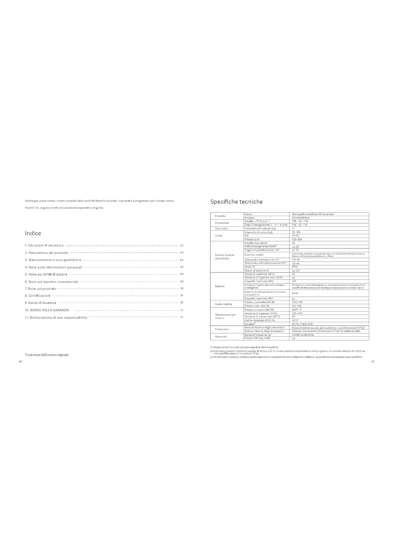 Traduzione dell'avviso originale Grazie per avere scelto i nostri prodoi della serie Mi Electric Scooter. Il prodoo è progeato per il tempo libero. Xiaomi Inc. augura a tui una piacevole esperienza di guida. Specifiche tecniche [1] Altezza veicolo: dal suolo alla parte superiore del monopaino. [2] Autonomia generale: misurata in assenza di vento e a 25 °C, con monopaino completamente carico e guida a una velocità costante di 12 km/h su una superficie piaa con un carico di 75 kg. [3] Per ricaricare la baeria, utilizzare esclusivamente il caricabaerie fornito in dotazione. Verificare i parametri del caricabaerie nelle specifiche. Monopaino elerico Mi Essential DDHBC08NEB 108 × 42 × 114 108 × 42 × 49