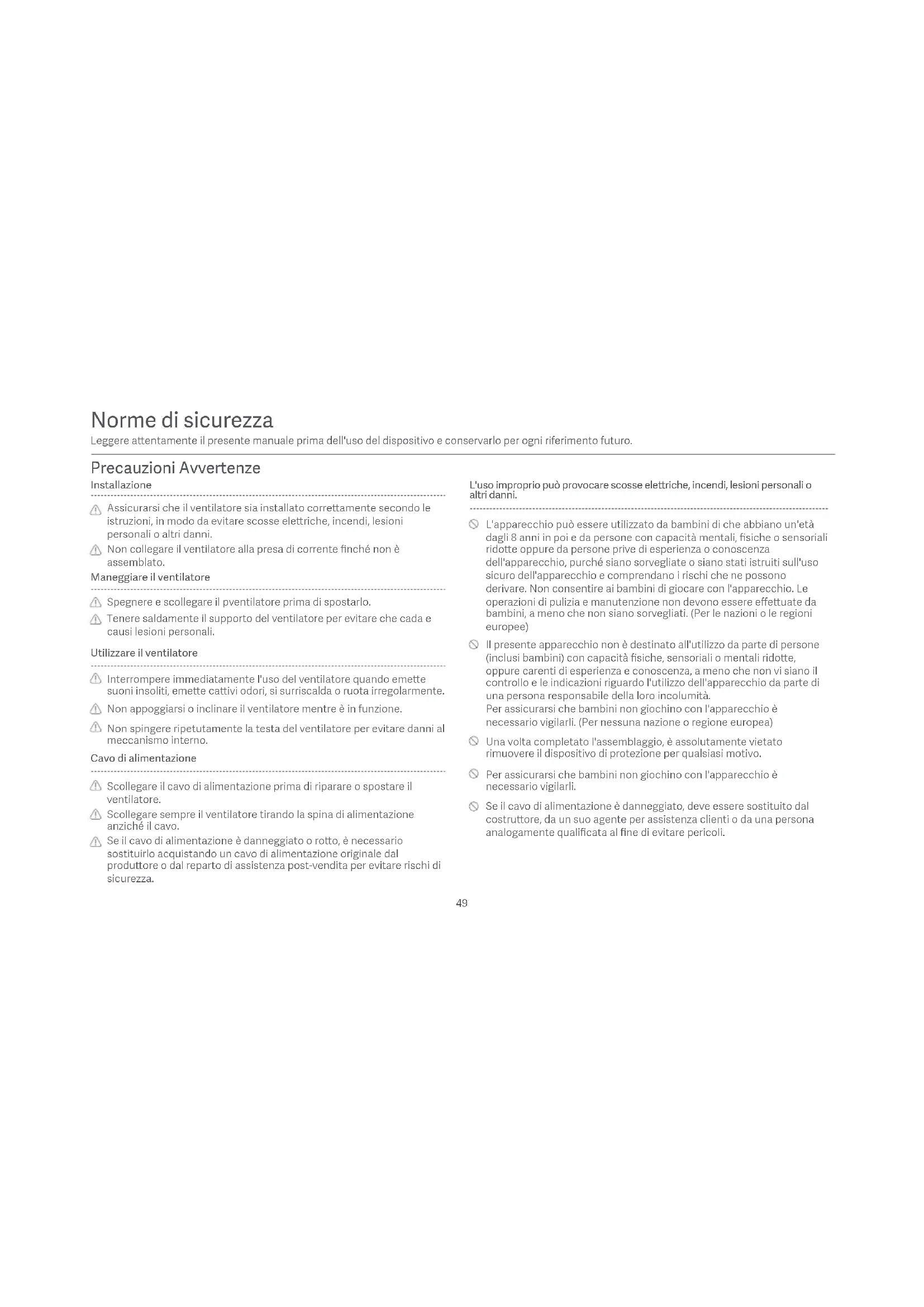 Stato spia Wi-Fi Stato Wi-Fi Stato della spia Arancione lampeggiante Blu lampeggiante Blu arancione In aesa di connessione Connessione in corso Connesso Impossibile conneere Il Mi Account a cui è associato il ventilatore è stato modificato. Il router a cui è collegato ventilatore è stato modificato. L'account o la password del router a cui è collegato ventilatore è stato modificato. Mi Home/Xiaomi Home non può controllare il ventilatore. La connessione Wi-Fi deve essere ripristinata nelle circostanze elencate nella tabella seguente. Researe il Wi-Fi Premere e tenere premuti contemporaneamente i pulsanti e . Quando viene emesso un segnale acustico prolungato, la connessione Wi-Fi è stata ripristinata correamente e quindi il Wi-Fi è in aesa di una connessione. È possibile abilitare la funzione di blocco bambini in Mi Home/Xiaomi Home. Una volta abilitato, il ventilatore non risponderà alle operazioni del pulsante ma invece a tui gli indicatori che lampeggiano due volte con due segnali acustici. È possibile disabilitare la funzione di blocco bambini in Mi Home/Xiaomi Home. Anche il ripristino della connessione Wi-Fi o lo scollegamento e il ricollegamento del ventilatore possono disabilitare questa funzione. Blocco di sicurezza per bambini Abilitare DisabilitareRisoluzione dei problemi Guasto Il ventilatore non funziona Il Wi-Fi non è in grado di conneersi Le pale del ventilatore sono bloccate Nessuna elericità dalla presa di corrente o il ventilatore non si collega all'alimentazione. Il gruppo pala del ventilatore o le griglie non sono installati correamente. Blocco bambini abilitato. Disabilitare il blocco bambini in Mi Home/Xiaomi Home o scollega il ventilatore dall'alimentazione, quindi ricollegarlo. Seguire i passaggi nel manuale utente per verificare e assicurarsi che siano installati in modo sicuro. Collegare a una presa di corrente che soddisfi i requisiti del ventilatore. Possibile causa Soluzione La connessione Wi-Fi è di 5 GHz. Il ventilatore è offline per più di mezz'ora. Le pale del ventilatore sono bloccate da un oggeo estraneo. Scollegare il ventilatore e rimuovere l'oggeo estraneo. Researe il Wi-Fi. Collegare a una connessione Wi-Fi a 2,4 GHz.