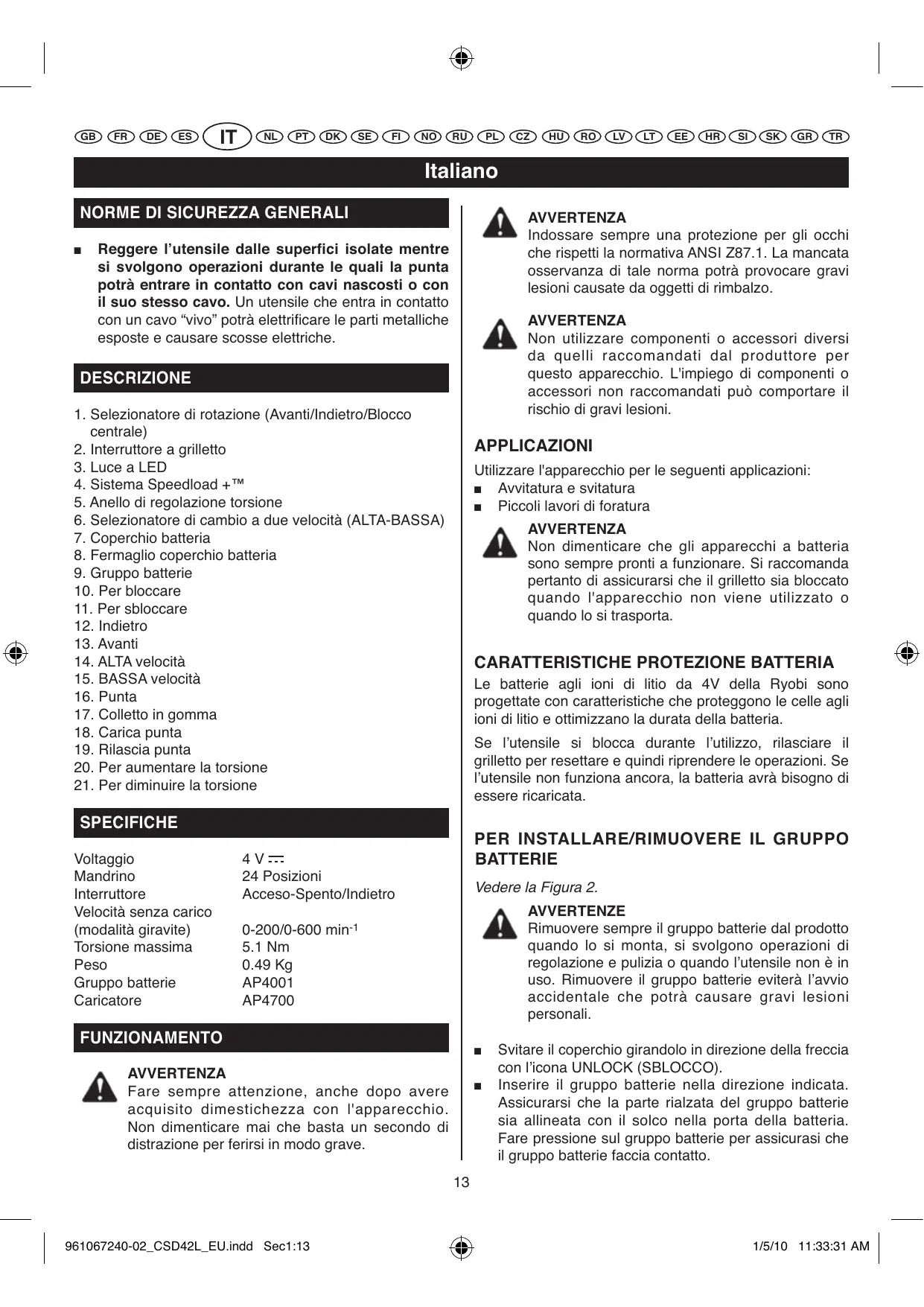 MANUALE UTENTE CSD 40 LI, CSD42L RYOBI