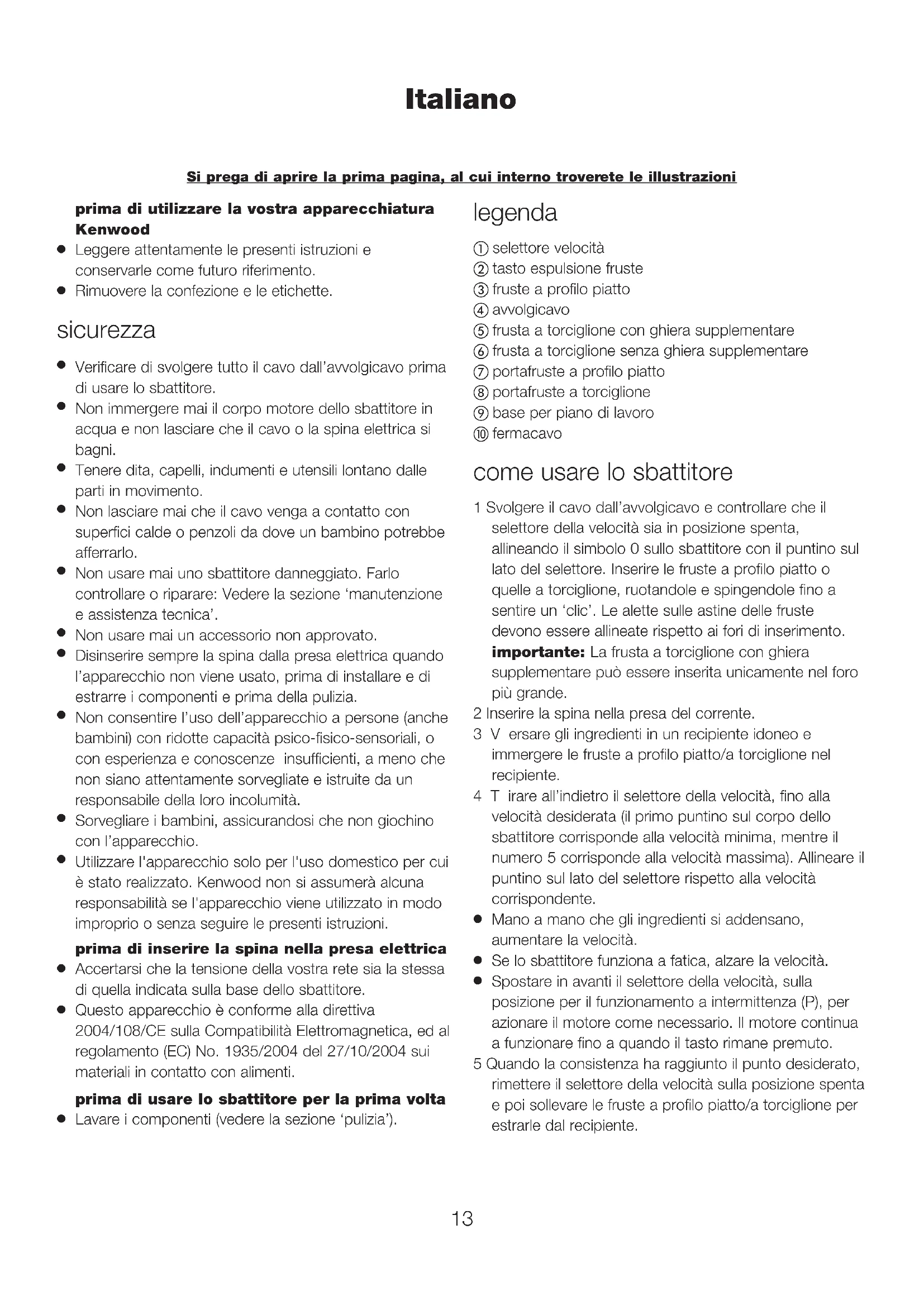 Utilizzare l'apparecchio solo per l'uso domestico per cui è stato realizzato. Kenwood non si assumerà alcuna responsabilità se l'apparecchio viene utilizzato in modo improprio o senza seguire le presenti istruzioni. prima di inserire la spina nella presa elettrica
