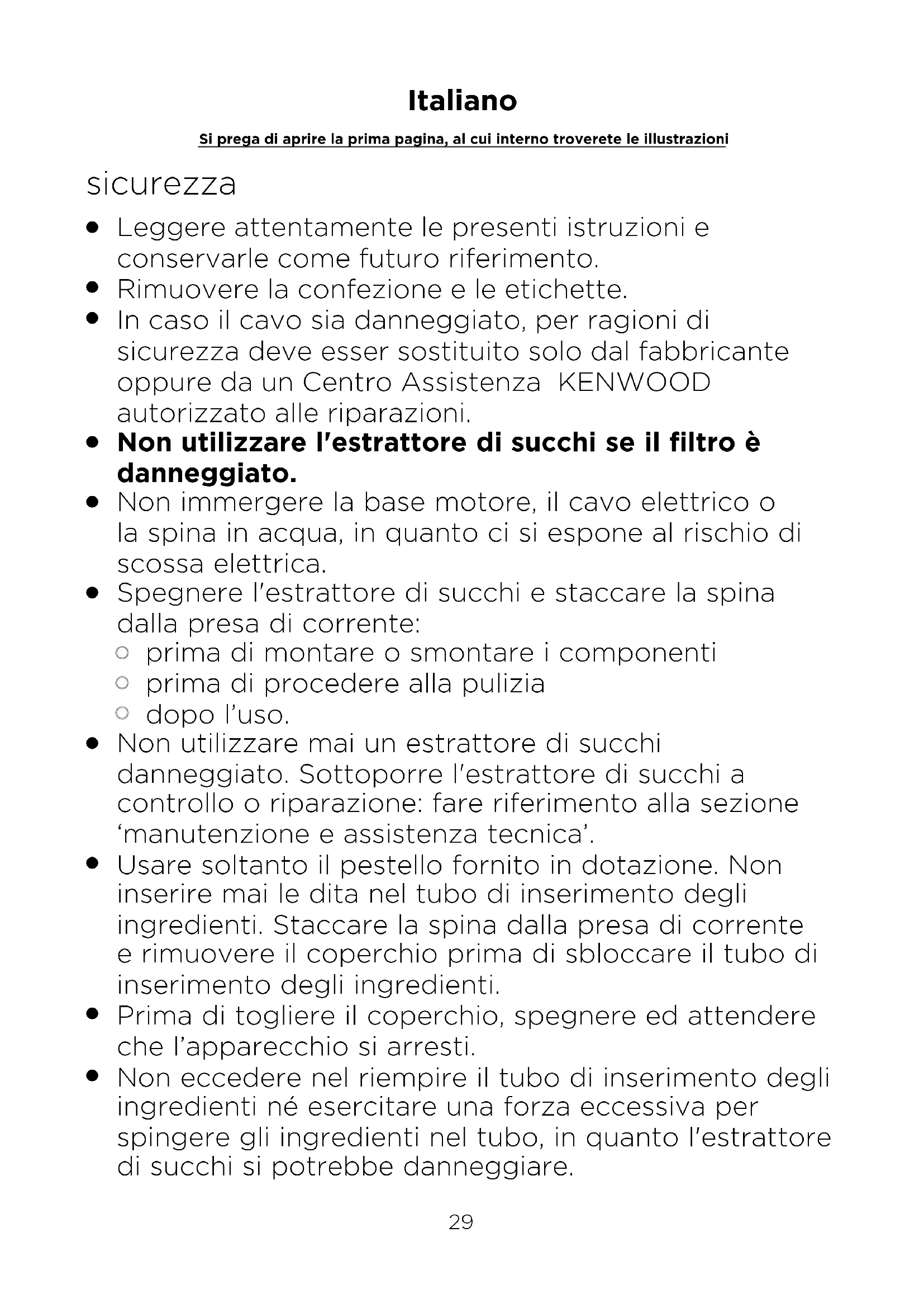 Non eccedere nel riempire il tubo di inserimento degli ingredienti né esercitare una forza eccessiva per spingere gli ingredienti nel tubo, in quanto l'estrattore di succhi si potrebbe danneggiare. Italiano Si prega di aprire la prima pagina, al cui interno troverete le illustrazioni29 30