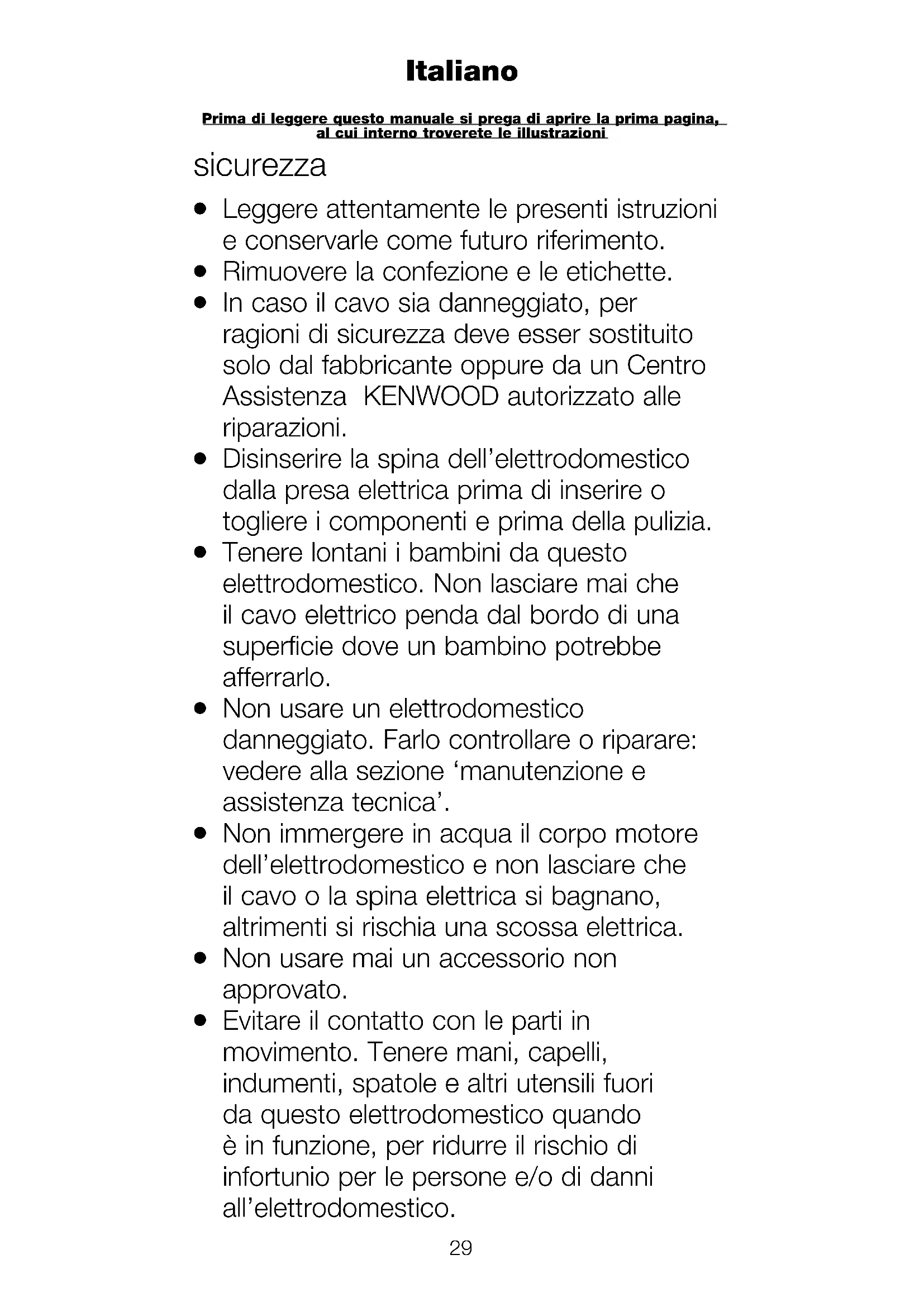In caso il cavo sia danneggiato, per ragioni di sicurezza deve esser sostituito solo dal fabbricante oppure da un Centro Assistenza KENWOOD autorizzato alle riparazioni.