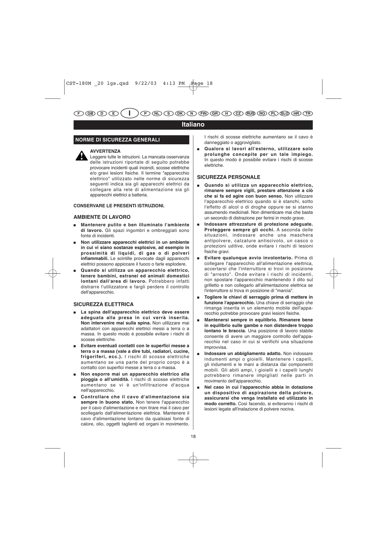 Quando si utilizza un apparecchio elettrico, rimanere sempre vigili, prestare attenzione a ciò che si fa ed agire con buon senso. Non utilizzare l'apparecchio elettrico quando si è stanchi, sotto l'effetto di alcol o di droghe oppure se si stanno assumendo medicinali. Non dimenticare mai che basta un secondo di distrazione per ferirsi in modo grave. Indossare attrezzature di protezione adeguate. Proteggere sempre gli occhi. A seconda delle situazioni, indossare anche una maschera antipolvere, calzature antiscivolo, un casco o protezioni uditive, onde evitare i rischi di lesioni fisiche gravi. Evitare qualunque avvio involontario. Prima di collegare l'apparecchio all'alimentazione elettrica, accertarsi che l'interruttore si trovi in posizione di "arresto". Onde evitare i rischi di incidenti, non spostare l'apparecchio mantenendo il dito sul grilletto e non collegarlo all'alimentazione elettrica se l'interruttore si trova in posizione di "marcia". Togliere le chiavi di serraggio prima di mettere in funzione l'apparecchio. Una chiave di serraggio che rimanga inserita in un elemento mobile dell'apparecchio potrebbe provocare gravi lesioni fisiche. Mantenersi sempre in equilibrio. Rimanere bene in equilibrio sulle gambe e non distendere troppo lontano le braccia. Una posizione di lavoro stabile consente di avere un maggiore controllo dell'apparecchio nel caso in cui si verifichi una situazione improvvisa. Indossare un abbigliamento adatto. Non indossare indumenti ampi o gioielli. Mantenere i capelli, gli indumenti e le mani a distanza dai componenti mobili. Gli abiti ampi, i gioielli e i capelli lunghi potrebbero rimanere impigliati nelle parti in movimento dell'apparecchio. Nel caso in cui l'apparecchio abbia in dotazione un dispositivo di aspirazione della polvere, assicurarsi che venga installato ed utilizzato in modo corretto. Così facendo, si eviteranno i rischi di lesioni legate all'inalazione di polvere nociva. CST-180M _20 lgs.qxd
