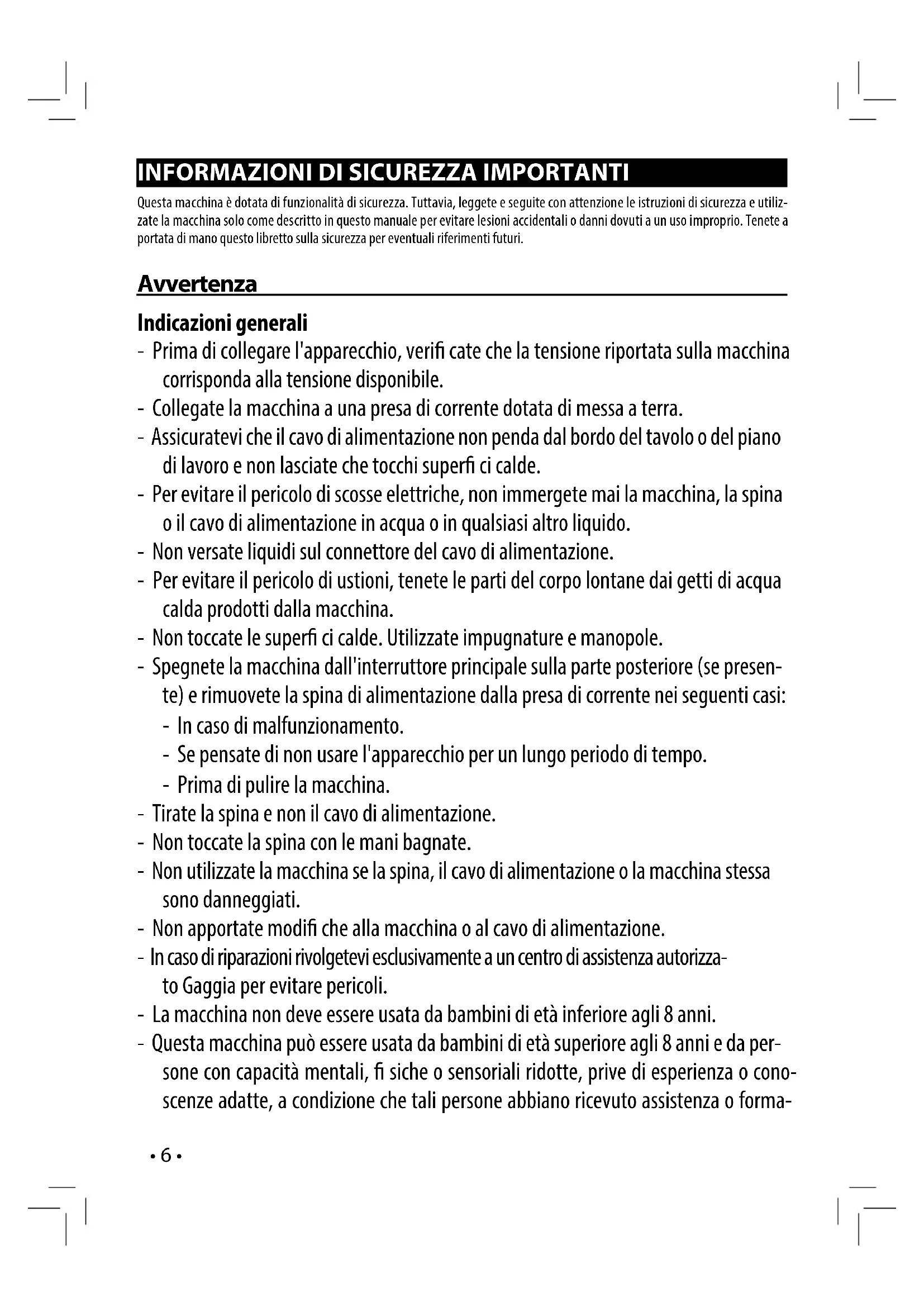 Questa macchina è dotata di funzionalità di sicurezza. Tuttavia, leggete e seguite con attenzione le istruzioni di sicurezza e utiliz- zate la macchina solo come descritto in questo manuale per evitare lesioni accidentali o danni dovuti a un uso improprio. Tenete a portata di mano questo libretto sulla sicurezza per eventuali riferimenti futuri. Avvertenza Indicazioni generali - Prima di collegare l'apparecchio, veri cate che la tensione riportata sulla macchina corrisponda alla tensione disponibile. - Collegate la macchina a una presa di corrente dotata di messa a terra. - Assicuratevi che il cavo di alimentazione non penda dal bordo del tavolo o del piano di lavoro e non lasciate che tocchi super ci calde. - Per evitare il pericolo di scosse elettriche, non immergete mai la macchina, la spina o il cavo di alimentazione in acqua o in qualsiasi altro liquido. - Non versate liquidi sul connettore del cavo di alimentazione. - Per evitare il pericolo di ustioni, tenete le parti del corpo lontane dai getti di acqua calda prodotti dalla macchina. - Non toccate le super ci calde. Utilizzate impugnature e manopole. - Spegnete la macchina dall'interruttore principale sulla parte posteriore (se presen- te) e rimuovete la spina di alimentazione dalla presa di corrente nei seguenti casi: - In caso di malfunzionamento. - Se pensate di non usare l'apparecchio per un lungo periodo di tempo. - Prima di pulire la macchina. - Tirate la spina e non il cavo di alimentazione. - Non toccate la spina con le mani bagnate. - Non utilizzate la macchina se la spina, il cavo di alimentazione o la macchina stessa sono danneggiati. - Non apportate modi che alla macchina o al cavo di alimentazione. - In caso di riparazioni rivolgetevi esclusivamente a un centro di assistenza autorizza- to Gaggia per evitare pericoli. - La macchina non deve essere usata da bambini di età inferiore agli 8 anni. - Questa macchina può essere usata da bambini di età superiore agli 8 anni e da per- sone con capacità mentali, siche o sensoriali ridotte, prive di esperienza o cono- scenze adatte, a condizione che tali persone abbiano ricevuto assistenza o forma-• 7 • zione per utilizzare la macchina in maniera sicura e capiscano i potenziali pericoli associati a tale uso. - La manutenzione e la pulizia possono essere eseguite da bambini purché di età superiore agli 8 anni e in presenza di un adulto. - Tenete la macchina e il relativo cavo lontano dalla portata di bambini di età inferio- re agli 8 anni. - Adottate le dovute precauzioni per evitare che i bambini giochino con la macchina. - Fate attenzione quando erogate acqua calda. All'inizio dell'erogazione possono ve- ri carsi brevi spruzzi di acqua calda. Prima di rimuovere l'erogatore di acqua calda attendete che il ciclo di erogazione termini. Attenzione Indicazioni generali - Questa macchina è destinata esclusivamente a un uso domestico. Non deve essere utilizzata in ambienti quali cucine dei dipendenti all'interno di punti vendita, u ci, aziende agricole o altri ambienti lavorativi. - Posizionate sempre la macchina su una super cie piana e stabile. Tenetela in posi- zione verticale, anche durante il trasporto. - Non posizionate la macchina su una piastra calda o vicino a un forno caldo, un calo- rifero o fonti di calore simili. - Inserite esclusivamente ca è macinato nel porta ltro pressurizzato. L'inserimento di ca è in grani, ca è solubile, ca è in grani non tostato o qualsiasi altra sostanza potrebbe danneggiare la macchina. In questo caso un'eventuale riparazione non è coperta da garanzia. - Lasciate ra reddare la macchina prima di inserire o rimuovere qualsiasi componen- te. Le super ci riscaldanti potrebbero trattenere calore residuo dopo l'uso. - Non riempite mai il serbatoio dell'acqua con acqua calda, bollente o frizzante per evitare di danneggiare il serbatoio stesso e la macchina. - Non usate prodotti o sostanze abrasive o detergenti aggressivi, come benzina o acetone, per pulire la macchina. Utilizzate semplicemente un panno morbido inu- midito con acqua. - Eseguite regolarmente la pulizia anticalcare della macchina. In mancanza di tale pulizia l'apparecchio smetterà di funzionare correttamente. In questo caso un'e- ventuale riparazione non è coperta da garanzia.• 8 • - Non lasciate la macchina a temperature inferiori a 0°C/32°F. L'acqua lasciata nel sistema di riscaldamento potrebbe congelarsi e causare danni. - Non lasciate acqua nel serbatoio quando la macchina non verrà utilizzata per un lungo periodo di tempo. L'acqua potrebbe diventare contaminata. Utilizzate acqua fresca tutte le volte che usate la macchina. - Non utilizzate mai accessori o parti di altri produttori oppure componenti non con- sigliati in modo speci co da Gaggia. In caso di utilizzo di tali accessori o parti, la garanzia si annulla. - Una regolare pulizia e manutenzione prolungano la vita utile della macchina e assi- curano un ca è dal gusto e dalla qualità ottimale. - La macchina è esposta continuamente a umidità, ca è e calcare. Pertanto è molto importante pulire regolarmente la macchina ed eseguire la manutenzione come descritto nel manuale dell'utente. Se non si eseguono queste procedure di pulizia e manutenzione, la macchina potrebbe anche smettere di funzionare. In questo caso un'eventuale riparazione non è coperta da garanzia. - Non lavate il porta ltro pressurizzato in lavastoviglie e non utilizzate detersivi per piatti o detergenti, poiché potreste provocare il malfunzionamento del porta ltro pressurizzato e il sapore del ca è potrebbe risentirne. - Non asciugate il gruppo infusore con panni per evitare l'accumulo di bre al suo interno. - Non ingerite mai la soluzione erogata durante il processo di rimozione del calcare. - Non disinseirire (togliere) mai il porta ltro in pressione durante l’erogazione del ca è. Durante la fase di riscaldamento del gruppo erogazione ca è possono uscire gocce d’acqua calda. - La macchina non deve essere posizionata in 
