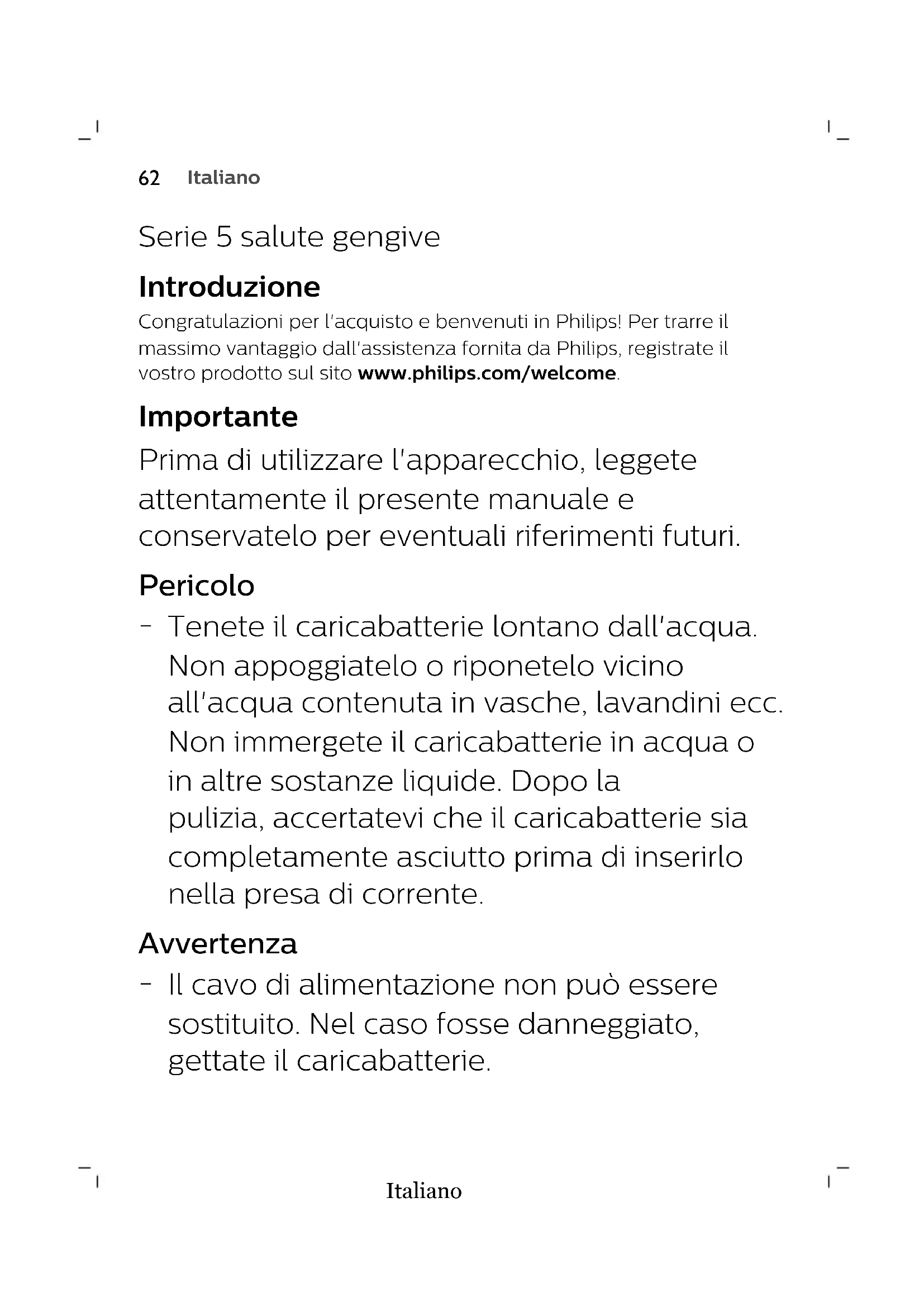 FrançaisItaliano Serie 5 salute gengive Introduzione Congratulazioni per l'acquisto e benvenuti in Philips! Per trarre il massimo vantaggio dall'assistenza fornita da Philips, registrate il vostro prodotto sul sito www.philips.com/welcome. Importante Prima di utilizzare l'apparecchio, leggete attentamente il presente manuale e conservatelo per eventuali riferimenti futuri. Pericolo