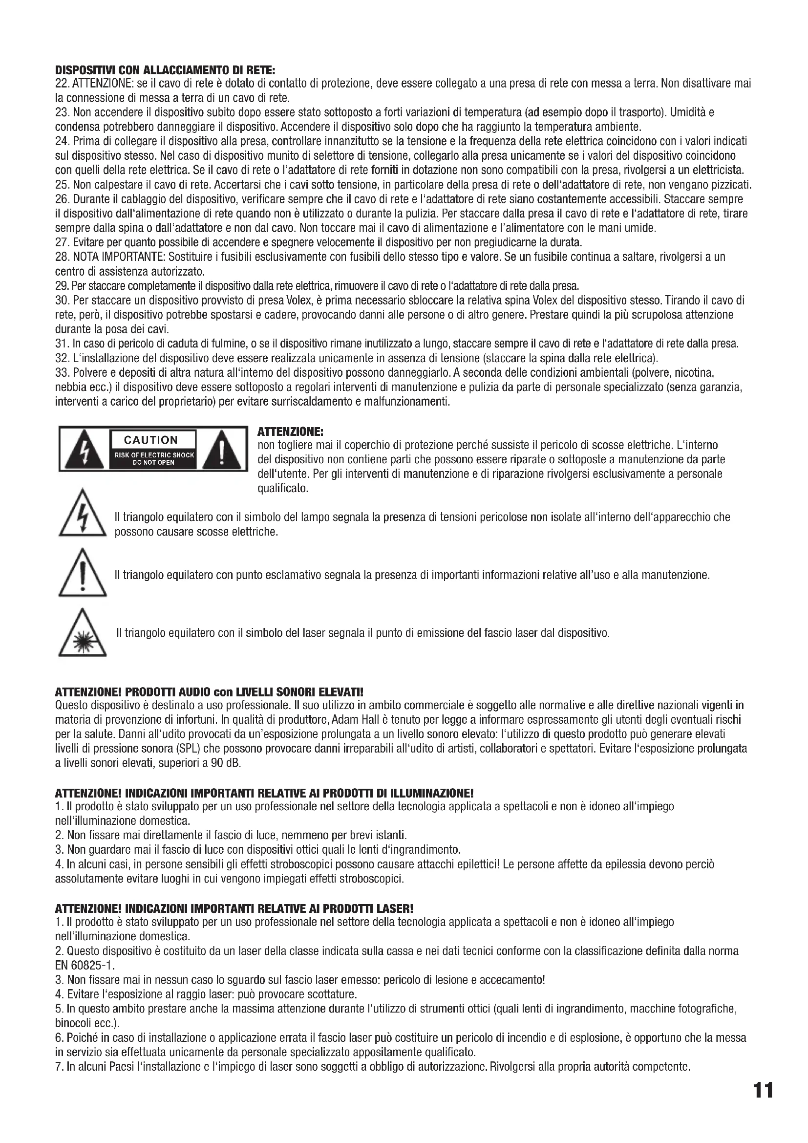 28. NOTA IMPORTANTE: Sostituire i fusibili esclusivamente con fusibili dello stesso tipo e valore. Se un fusibile continua a saltare, rivolgersi a un centro di assistenza autorizzato. 29. Per staccare completamente il dispositivo dalla rete elettrica, rimuovere il cavo di rete o l‘adattatore di rete dalla presa. 30. Per staccare un dispositivo provvisto di presa Volex, è prima necessario sbloccare la relativa spina Volex del dispositivo stesso. Tirando il cavo di rete, però, il dispositivo potrebbe spostarsi e cadere, provocando danni alle persone o di altro genere. Prestare quindi la più scrupolosa attenzione durante la posa dei cavi. 31. In caso di pericolo di caduta di fulmine, o se il dispositivo rimane inutilizzato a lungo, staccare sempre il cavo di rete e l‘adattatore di rete dalla presa. 32. L‘installazione del dispositivo deve essere realizzata unicamente in assenza di tensione (staccare la spina dalla rete elettrica). 33. Polvere e depositi di altra natura all‘interno del dispositivo possono danneggiarlo. A seconda delle condizioni ambientali (polvere, nicotina, nebbia ecc.) il dispositivo deve essere sottoposto a regolari interventi di manutenzione e pulizia da parte di personale specializzato (senza garanzia, interventi a carico del proprietario) per evitare surriscaldamento e malfunzionamenti. ATTENZIONE: non togliere mai il coperchio di protezione perché sussiste il pericolo di scosse elettriche. L‘interno del dispositivo non contiene parti che possono essere riparate o sottoposte a manutenzione da parte dell‘utente. Per gli interventi di manutenzione e di riparazione rivolgersi esclusivamente a personale qualificato. Il triangolo equilatero con il simbolo del lampo segnala la presenza di tensioni pericolose non isolate all‘interno dell‘apparecchio che possono causare scosse elettriche. Il triangolo equilatero con punto esclamativo segnala la presenza di importanti informazioni relative all’uso e alla manutenzione. Il triangolo equilatero con il simbolo del laser segnala il punto di emissione del fascio laser dal dispositivo. ATTENZIONE! PRODOTTI AUDIO con LIVELLI SONORI ELEVATI! Questo dispositivo è destinato a uso professionale. Il suo utilizzo in ambito commerciale è soggetto alle normative e alle direttive nazionali vigenti in materia di prevenzione di infortuni. In qualità di produttore, Adam Hall è tenuto per legge a informare espressamente gli utenti degli eventuali rischi per la salute. Danni all‘udito provocati da un’esposizione prolungata a un livello sonoro elevato: l‘utilizzo di questo prodotto può generare elevati livelli di pressione sonora (SPL) che possono provocare danni irreparabili all‘udito di artisti, collaboratori e spettatori. Evitare l‘esposizione prolungata a livelli sonori elevati, superiori a 90dB. ATTENZIONE! INDICAZIONI IMPORTANTI RELATIVE AI PRODOTTI DI ILLUMINAZIONE! 1. Il prodotto è stato sviluppato per un uso professionale nel settore della tecnologia applicata a spettacoli e non è idoneo all‘impiego nell‘illuminazione domestica.