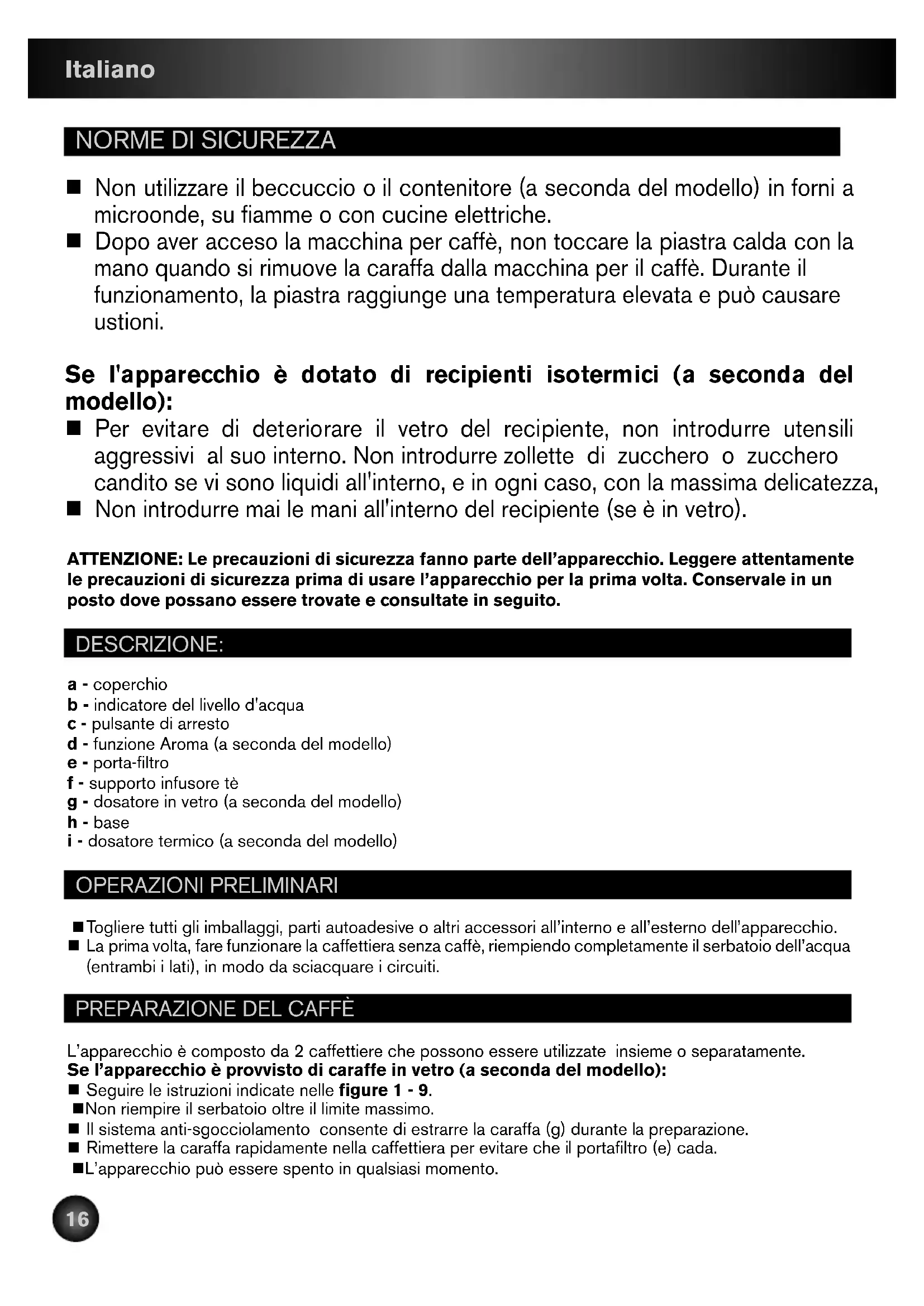 n Non utilizzare il beccuccio o il contenitore (a seconda del modello) in forni a microonde, su fiamme o con cucine elettriche. n Dopo aver acceso la macchina per caffè, non toccare la piastra calda con la mano quando si rimuove la caraffa dalla macchina per il caffè. Durante il funzionamento, la piastra raggiunge una temperatura elevata e può causare ustioni. Se l'apparecchio è dotato di recipienti isotermici (a seconda del modello): n Per evitare di deteriorare il vetro del recipiente, non introdurre utensili aggressivi al suo interno. Non introdurre zollette di zucchero o zucchero candito se vi sono liquidi all'interno, e in ogni caso, con la massima delicatezza, n Non introdurre mai le mani all'interno del recipiente (se è in vetro). ATTENZIONE: Le precauzioni di sicurezza fanno parte dell’apparecchio. Leggere attentamente le precauzioni di sicurezza prima di usare l’apparecchio per la prima volta. Conservale in un posto dove possano essere trovate e consultate in seguito. DESCRIZIONE: a - coperchio b - indicatore del livello d'acqua c - pulsante di arresto d - funzione Aroma (a seconda del modello) e - porta-filtro f - supporto infusore tè g - dosatore in vetro (a seconda del modello) h - base i - dosatore termico (a seconda del modello) OPERAZIONI PRELIMINARI nTogliere tutti gli imballaggi, parti autoadesive o altri accessori all’interno e all’esterno dell’apparecchio. n La prima volta, fare funzionare la caffettiera senza caffè, riempiendo completamente il serbatoio dell’acqua (entrambi i lati), in modo da sciacquare i circuiti.