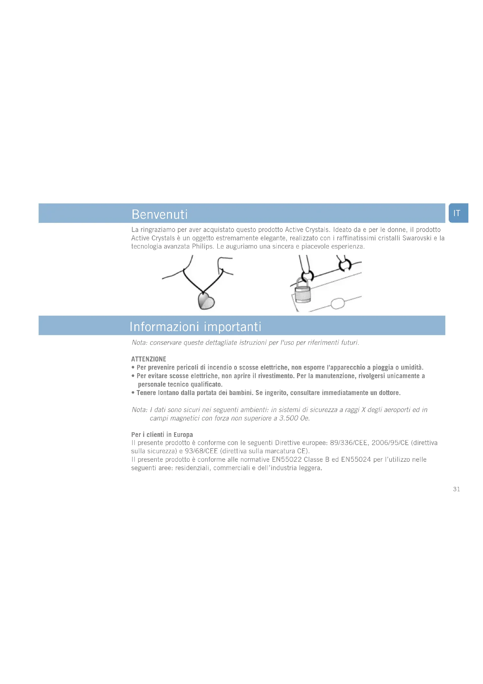 Technische Angaben Hilfe nötig?La ringraziamo per aver acquistato questo prodotto Active Crystals. Ideato da e per le donne, il prodotto Active Crystals è un oggetto estremamente elegante, realizzato con i raffinatissimi cristalli Swarovski e la tecnologia avanzata Philips. Le auguriamo una sincera e piacevole esperienza.