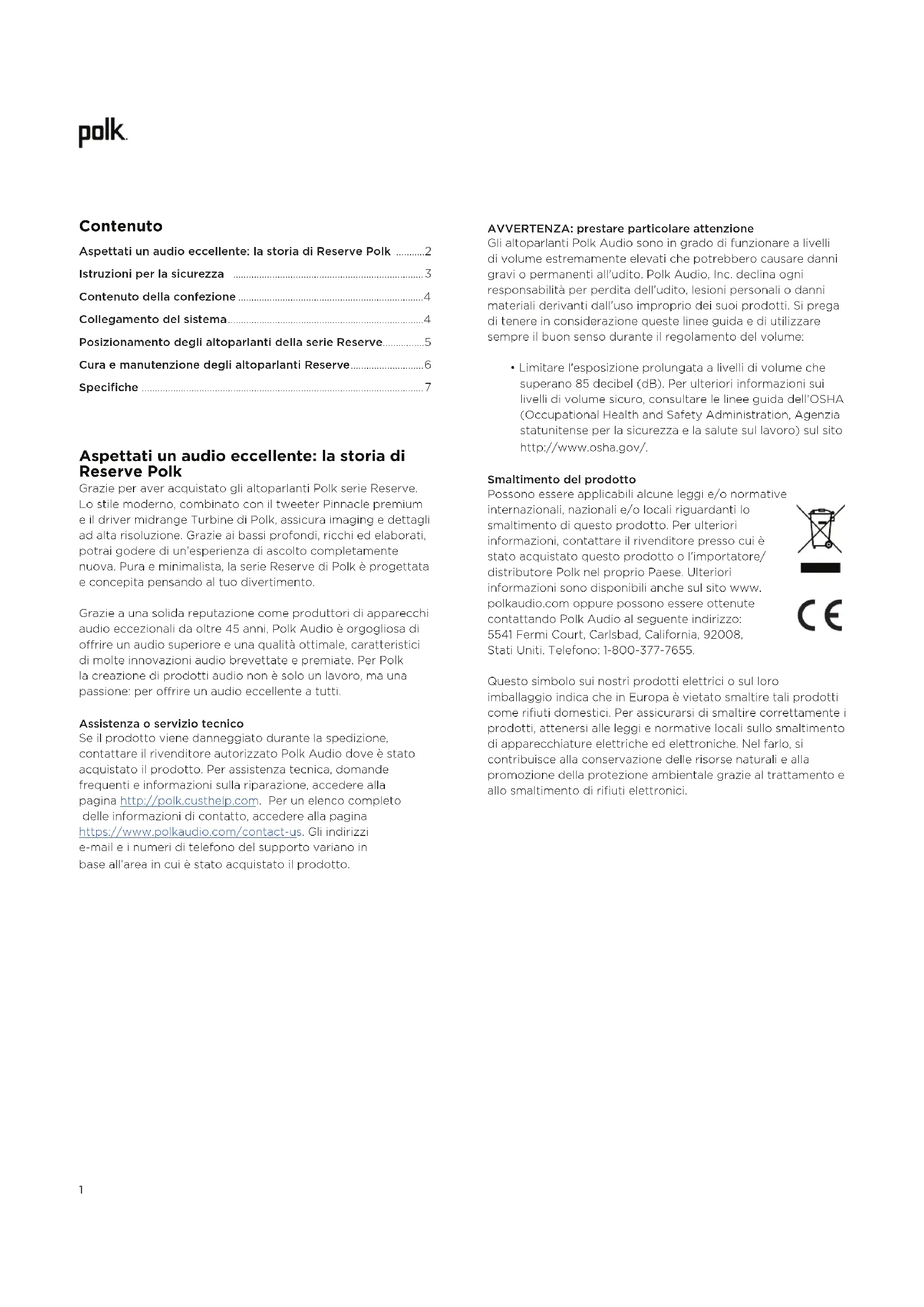 - Limitare l'esposizione prolungata a livelli di volume che superano 85 decibel (dB). Per ulteriori informazioni sui livelli di volume sicuro, consultare le linee guida dell’OSHA (Occupational Health and Safety Administration, Agenzia statunitense per la sicurezza e la salute sul lavoro) sul sito http://www.osha.gov/. Smaltimento del prodotto Possono essere applicabili alcune leggi e/o normative internazionali, nazionali e/o locali riguardanti lo smaltimento di questo prodotto. Per ulteriori informazioni, contattare il rivenditore presso cui è stato acquistato questo prodotto o l'importatore/ distributore Polk nel proprio Paese. Ulteriori informazioni sono disponibili anche sul sito www. polkaudio.com oppure possono essere ottenute contattando Polk Audio al seguente indirizzo: 5541 Fermi Court, Carlsbad, California, 92008, Stati Uniti. Telefono: 1-800-377-7655. Questo simbolo sui nostri prodotti elettrici o sul loro imballaggio indica che in Europa è vietato smaltire tali prodotti come rifiuti domestici. Per assicurarsi di smaltire correttamente i prodotti, attenersi alle leggi e normative locali sullo smaltimento di apparecchiature elettriche ed elettroniche. Nel farlo, si contribuisce alla conservazione delle risorse naturali e alla promozione della protezione ambientale grazie al trattamento e allo smaltimento di rifiuti elettronici. Aspettati un audio eccellente: la storia di Reserve Polk Grazie per aver acquistato gli altoparlanti Polk serie Reserve. Lo stile moderno, combinato con il tweeter Pinnacle premium e il driver midrange Turbine di Polk, assicura imaging e dettagli ad alta risoluzione. Grazie ai bassi profondi, ricchi ed elaborati, potrai godere di un'esperienza di ascolto completamente nuova. Pura e minimalista, la serie Reserve di Polk è progettata e concepita pensando al tuo divertimento. Grazie a una solida reputazione come produttori di apparecchi audio eccezionali da oltre 45 anni, Polk Audio è orgogliosa di orire un audio superiore e una qualità ottimale, caratteristici di molte innovazioni audio brevettate e premiate. Per Polk la creazione di prodotti audio non è solo un lavoro, ma una passione: per orire un audio eccellente a tutti. Assistenza o servizio tecnico Se il prodotto viene danneggiato durante la spedizione, contattare il rivenditore autorizzato Polk Audio dove è stato acquistato il prodotto. Per assistenza tecnica, domande frequenti e informazioni sulla riparazione, accedere alla pagina http://polk.custhelp.com. Per un elenco completo delle informazioni di contatto, accedere alla pagina https://www.polkaudio.com/contact-us. Gli indirizzi e-mail e i numeri di telefono del supporto variano in base all’area in cui è stato acquistato il prodotto. Contenuto Aspettati un audio eccellente: la storia di Reserve Polk ...........2 Istruzioni per la sicurezza .........................................................................3 Contenuto della confezione .......................................................................4 Collegamento del sistema ...........................................................................4 Posizionamento degli altoparlanti della serie Reserve................5 Cura e manutenzione degli altoparlanti Reserve ............................ 6 Specifiche ............................................................................................................72