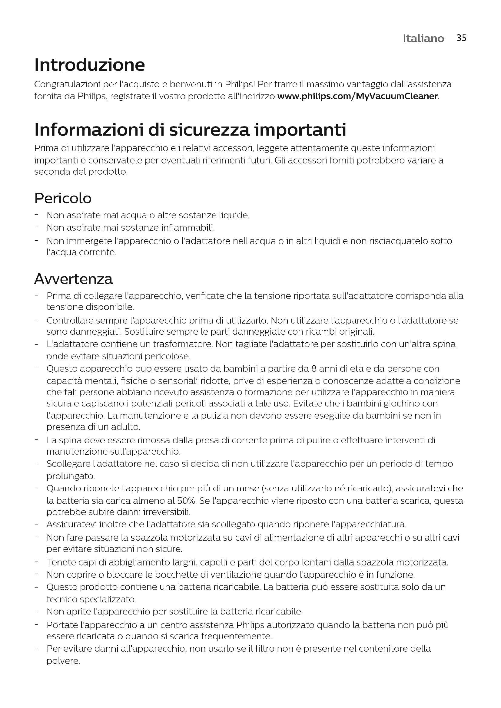 Italiano Introduzione Congratulazioni per l'acquisto e benvenuti in Philips! Per trarre il massimo vantaggio dall'assistenza fornita da Philips, registrate il vostro prodotto all'indirizzo www.philips.com/MyVacuumCleaner. Informazioni di sicurezza importanti Prima di utilizzare l'apparecchio e i relativi accessori, leggete attentamente queste informazioni importanti e conservatele per eventuali riferimenti futuri. Gli accessori forniti potrebbero variare a seconda del prodotto. Pericolo