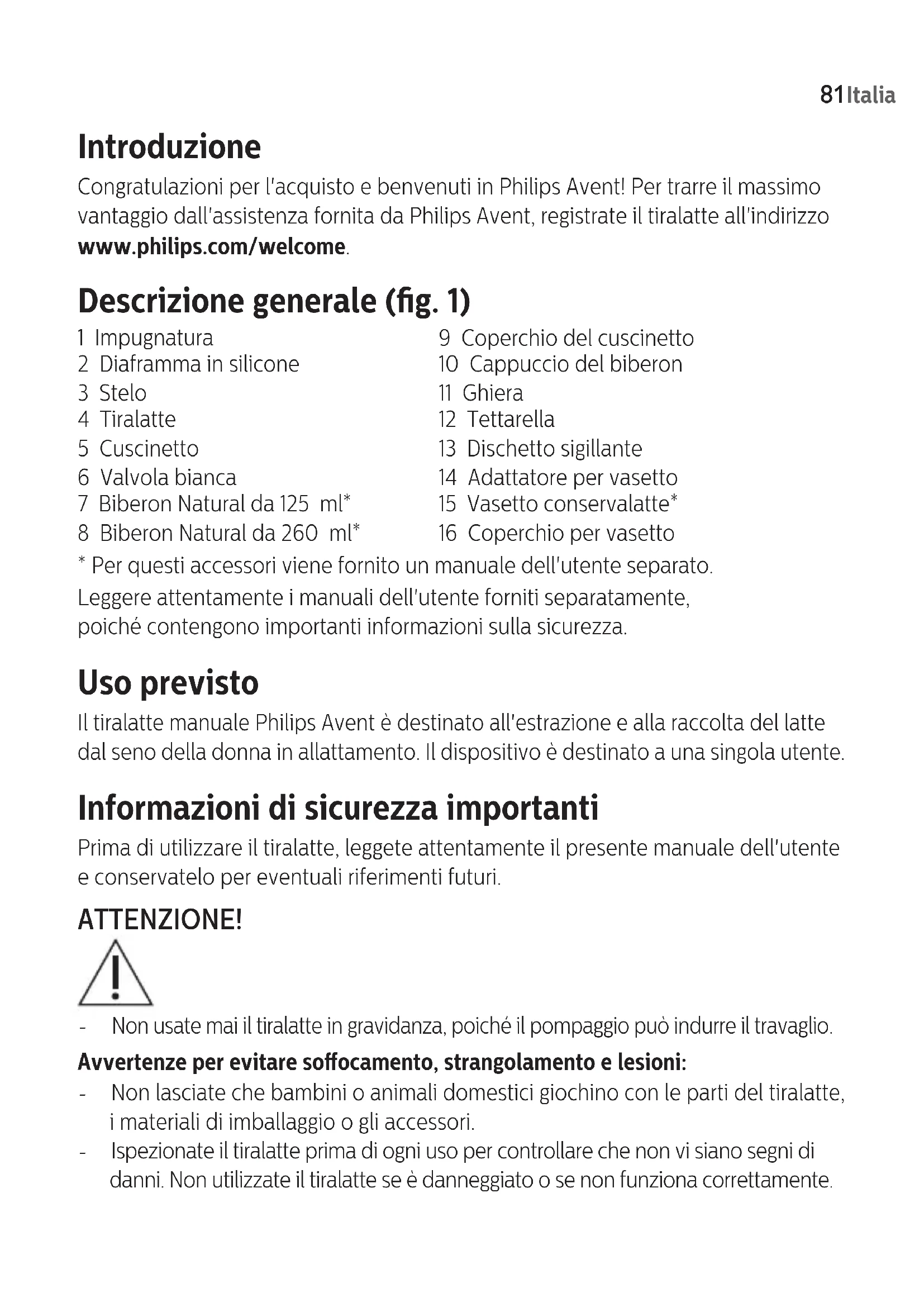 - Per questi accessori viene fornito un manuale dell'utente separato. Leggere attentamente i manuali dell'utente forniti separatamente, poiché contengono importanti informazioni sulla sicurezza. Uso previsto Il tiralatte manuale Philips Avent è destinato all'estrazione e alla raccolta del latte dal seno della donna in allattamento. Il dispositivo è destinato a una singola utente. Informazioni di sicurezza importanti Prima di utilizzare il tiralatte, leggete attentamente il presente manuale dell'utente e conservatelo per eventuali riferimenti futuri. ATTENZIONE! - Non usate mai il tiralatte in gravidanza, poiché il pompaggio può indurre il travaglio