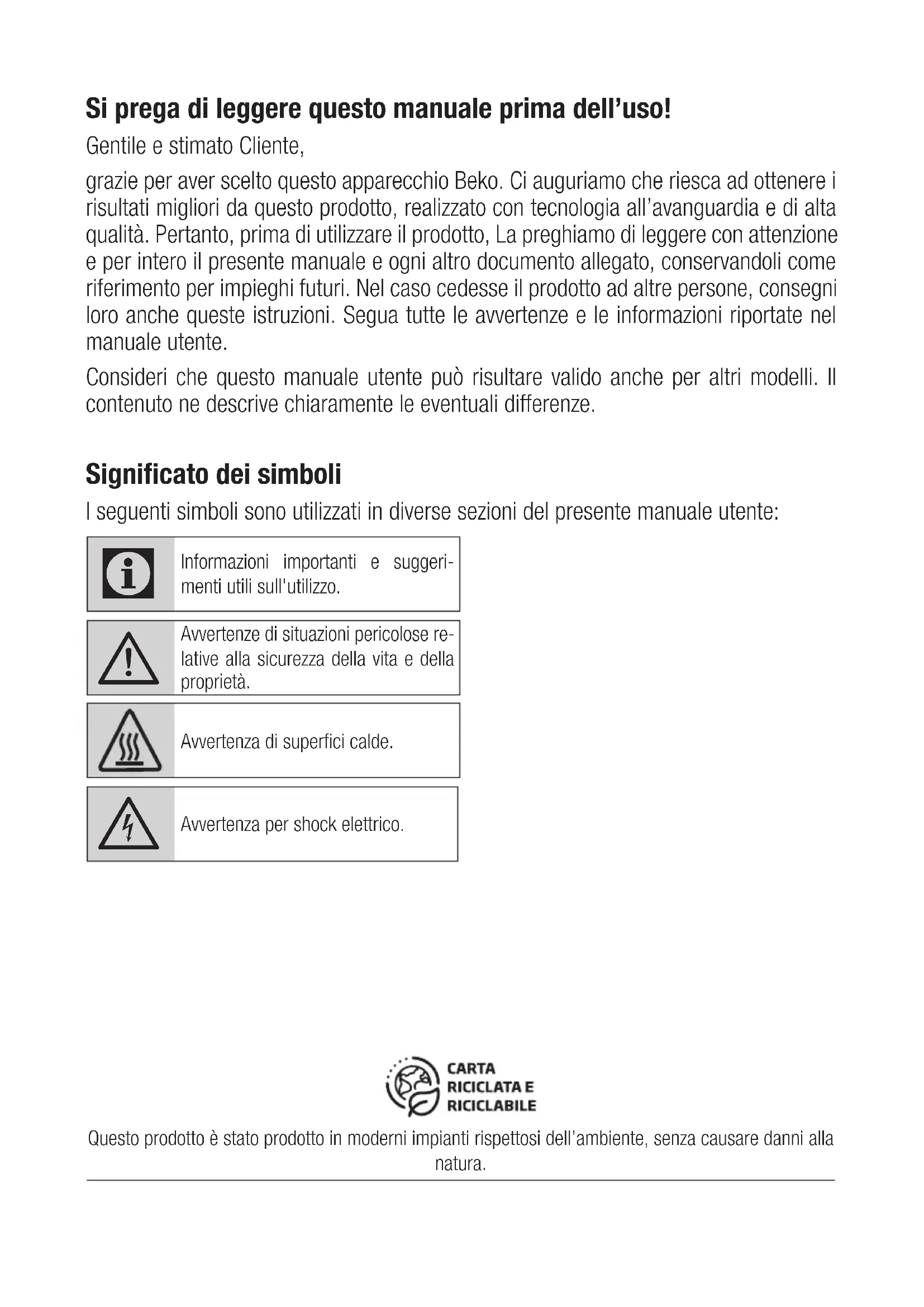 - záruka se nevztahuje na návštěvu technika za účelem poradenství, preventivní kontrolu stavu spotřebiče, výměnu náhradního dílu, který nevyžaduje odborný zásah, záměna směru otvírání dveří chladničekSi prega di leggere questo manuale prima dell’uso! Gentile e stimato Cliente, grazie per aver scelto questo apparecchio Beko. Ci auguriamo che riesca ad ottenere i risultati migliori da questo prodotto, realizzato con tecnologia all’avanguardia e di alta qualità. Pertanto, prima di utilizzare il prodotto, La preghiamo di leggere con attenzione e per intero il presente manuale e ogni altro documento allegato, conservandoli come riferimento per impieghi futuri. Nel caso cedesse il prodotto ad altre persone, consegni loro anche queste istruzioni. Segua tutte le avvertenze e le informazioni riportate nel manuale utente. Consideri che questo manuale utente può risultare valido anche per altri modelli. Il contenuto ne descrive chiaramente le eventuali differenze. Significato dei simboli I seguenti simboli sono utilizzati in diverse sezioni del presente manuale utente: