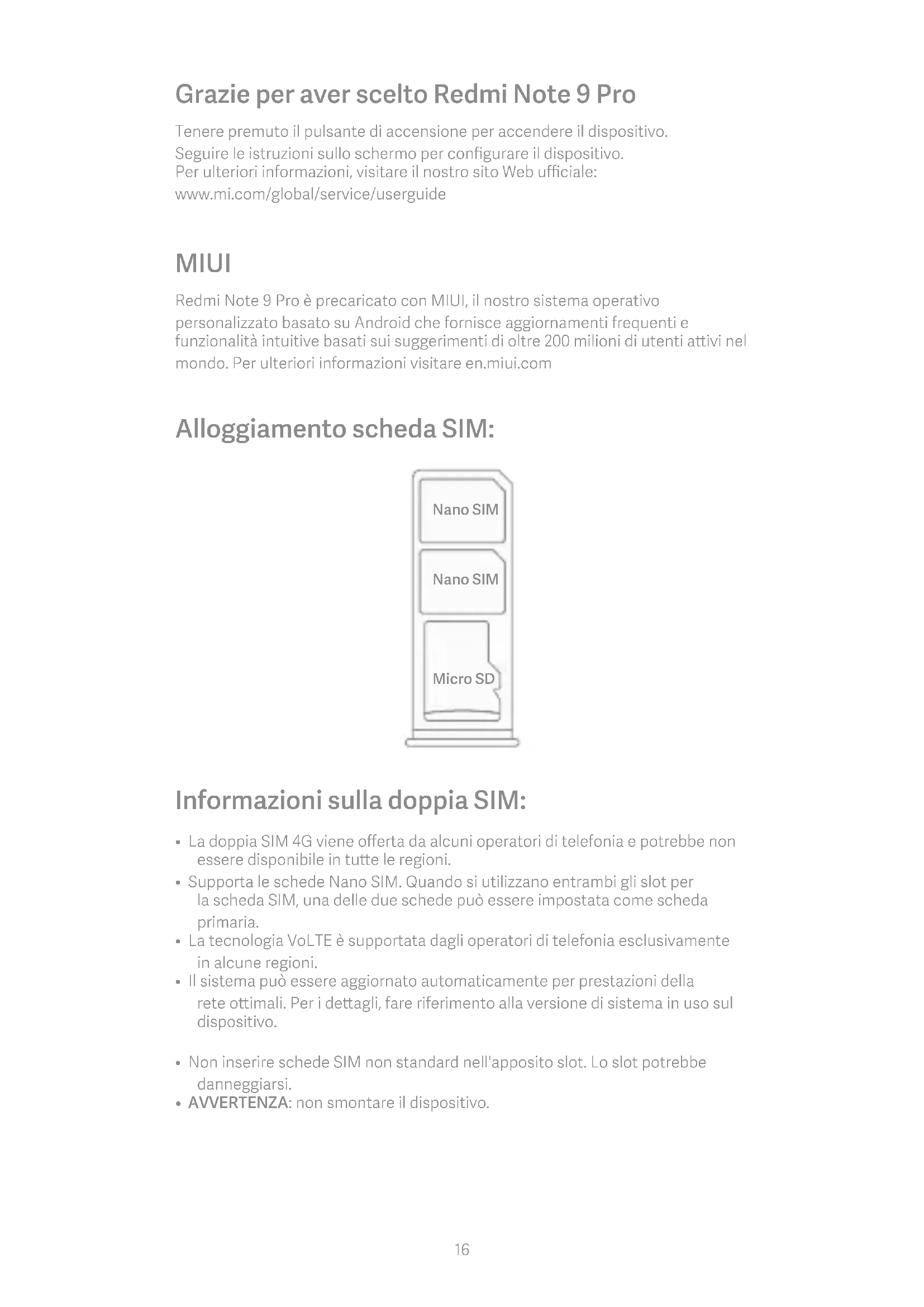 15Grazie per aver scelto Redmi Note 9 Pro Tenere premuto il pulsante di accensione per accendere il dispositivo. Seguire le istruzioni sullo schermo per configurare il dispositivo. Per ulteriori informazioni, visitare il nostro sito Web ufficiale: www.mi.com/global/service/userguide MIUI Redmi Note 9 Pro è precaricato con MIUI, il nostro sistema operativo personalizzato basato su Android che fornisce aggiornamenti frequenti e funzionalità intuitive basati sui suggerimenti di oltre 200 milioni di utenti aivi nel mondo. Per ulteriori informazioni visitare en.miui.com Alloggiamento scheda SIM: Micro SD Nano SIM Nano SIM Informazioni sulla doppia SIM: