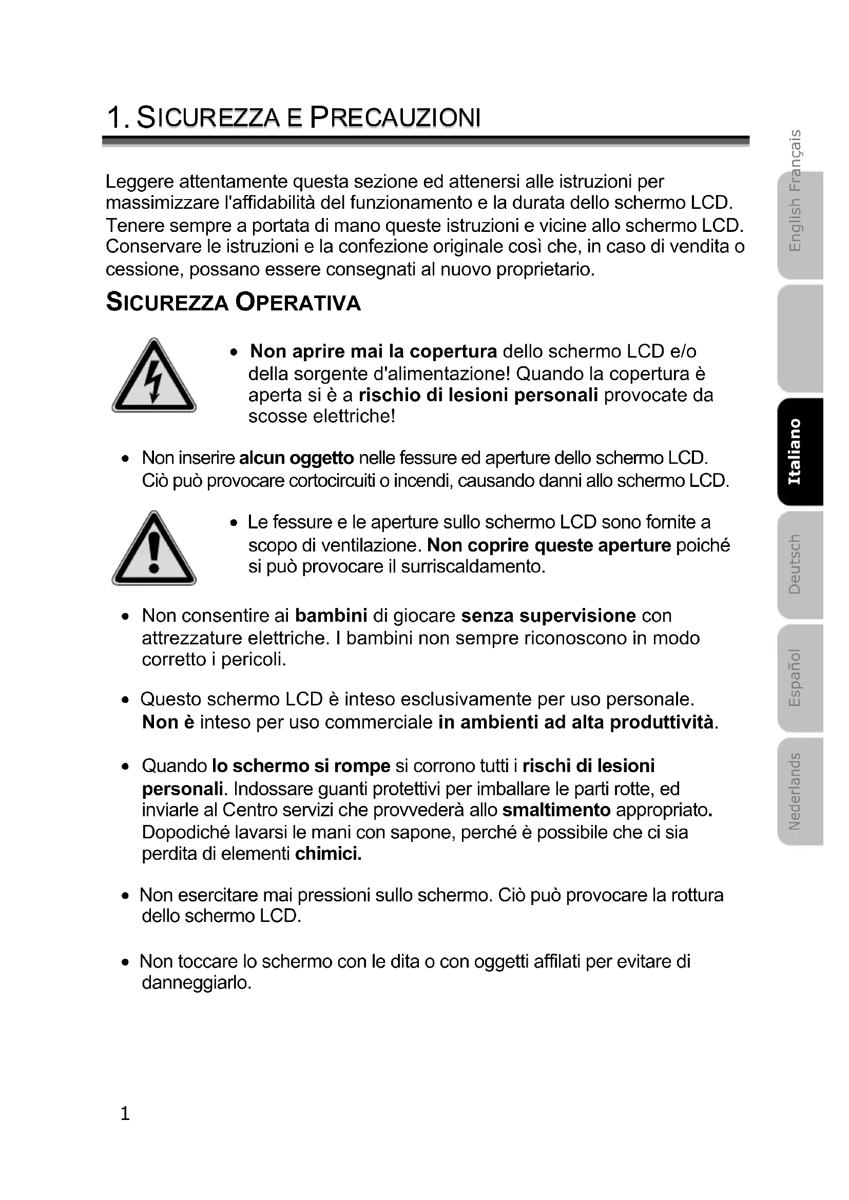 English Français Italiano Deutsch Español Nederlands PRECAUZIONI Â Cautela! All'interno della copertura dello schermo LCD non ci sono parti che necessitano di pulizia o manutenzione. La durata dello schermo LCD può essere aumentata prendendo le seguenti precauzioni: