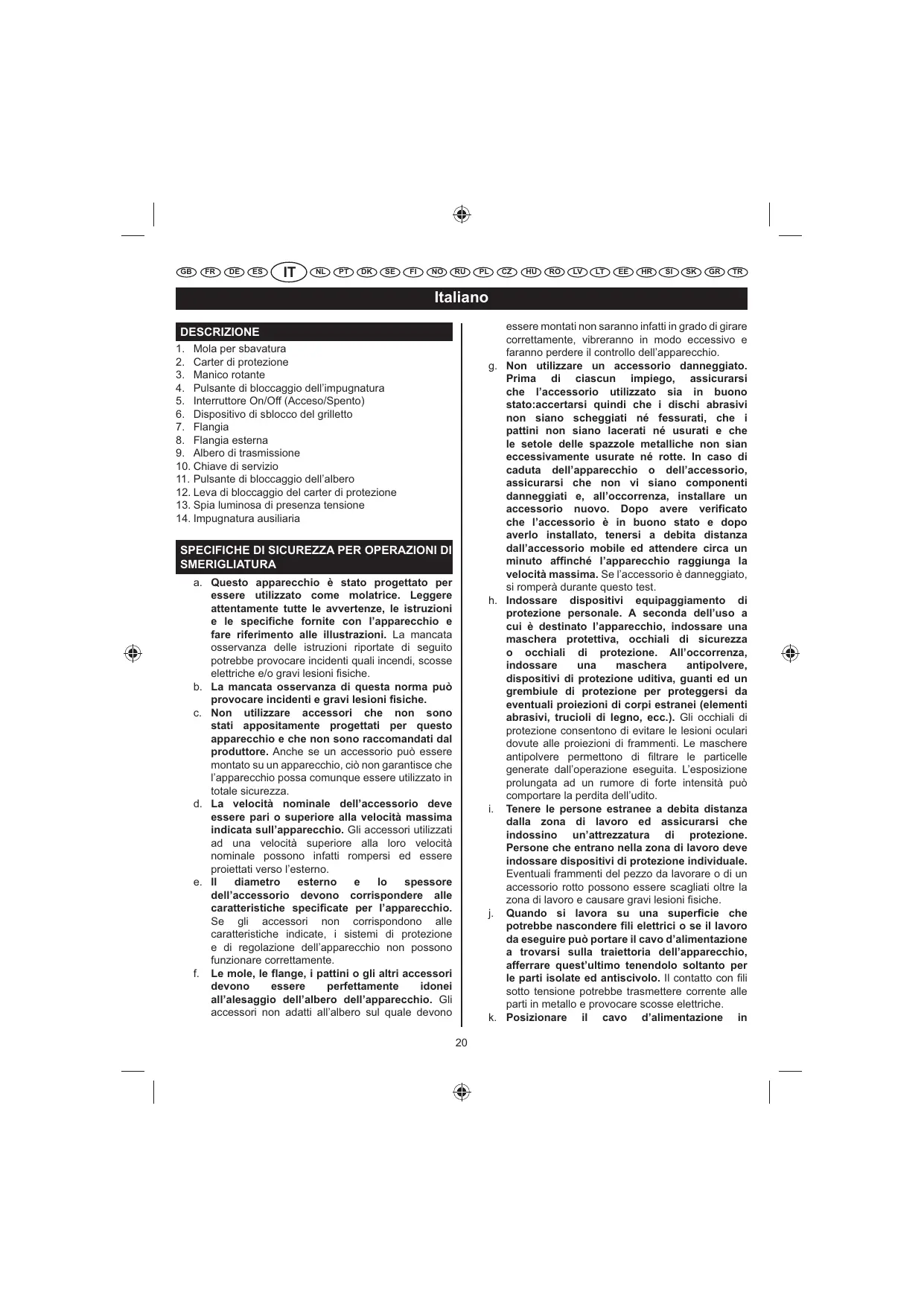 g. Non utilizzato un accessorio danneggiato. Prima di ciascun impiego, assicurarsi che l'accessorio utilizzato sia in buono stato: accertarsi quando che i dischi abrasivi non siano scheggiati né fessurati, che i patti non siano lacerati né usurati e che le setole delle spazzole metalliche non sian eccessivamente usurate né rotte. In caso di caduta dell'apparechio o dell'accessorio, assicurarsi che non vi siano componenti danneggiati e, all'occorrezza, installare un accessorio nuovo. Dopo aveo verificato che l'accessorio è in buono stato e dopo averlo installato, teneri a debita distanza dall'accessorio mobile ed attendere circa un minuto affinché l'apparechio raggiunga la velocità massima. Se l'accessorio è danneggiato, si romperà durante questo test.