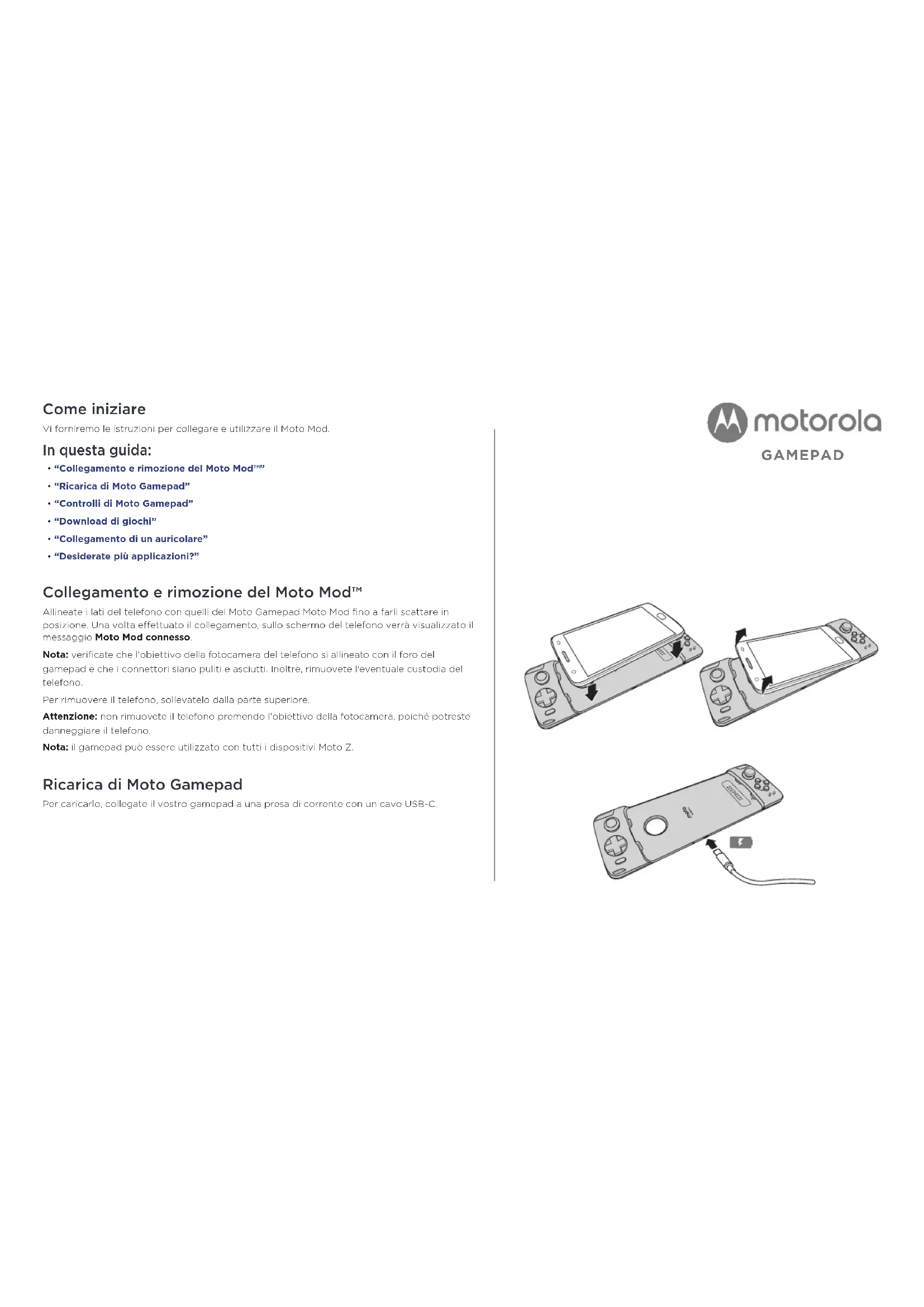 - “Desiderate più applicazioni?” Collegamento e rimozione del Moto Mod™ Allineate i lati del telefono con quelli del Moto Gamepad Moto Mod fino a farli scattare in posizione. Una volta eettuato il collegamento, sullo schermo del telefono verrà visualizzato il messaggio Moto Mod connesso. Nota: verificate che l'obiettivo della fotocamera del telefono si allineato con il foro del gamepad e che i connettori siano puliti e asciutti. Inoltre, rimuovete l'eventuale custodia del telefono. Per rimuovere il telefono, sollevatelo dalla parte superiore. Attenzione: non rimuovete il telefono premendo l'obiettivo della fotocamera, poiché potreste danneggiare il telefono. Nota: il gamepad può essere utilizzato con tutti i dispositivi Moto Z. Ricarica di Moto Gamepad Per caricarlo, collegate il vostro gamepad a una presa di corrente con un cavo USB-C. GAMEPADLivelli di carica I LED indicano il livello di carica del gamepad. LED Percentuale di carica 4 massima luminosità 100 4 Da 75 a 100 3 Da 50 a 75 2 Da 25 a 50 1 Da 0 a 25 Collegate il telefono al gamepad e la luce a Y indica che il telefono è in carica. Retro del gamepad Luce a YControlli di Moto Gamepad Il gamepad è totalmente connesso, pertanto vi ore accesso e controllo completi quando il telefono si collega al gamepad. Assumete il pieno controllo del gioco in un attimo. Nota: i comandi dipendono dal gioco e possono variare. Comandi Tasto START Premete per iniziare. Tasto SELECT Premete per selezionare un'opzione. Tasto HOME Premete per tornare alla schermata Home. Tasti di direzione Premete per spostarvi verso l'alto, verso il basso, verso sinistra o verso destra. Tasti di azione (X, Y, A e B) Premete per eseguire varie operazioni. Joystick destra e sinistra Spingete verso l'alto, verso il basso, verso sinistra e verso destra per spostare un oggetto. Premete per selezionare. Tasto sinistro 1 e 2 Premete per selezionare. Tasto destro 1 e 2 Premete per selezionare. Nota: tenete premuti i tasti Home e X per spegnere i LED. Download di giochi Per scaricare i giochi sul telefono. Procedura: Play Store (o App Center) Potete trovare facilmente i giochi compatibili sull'app Moto Game Explorer (o LeStore). Per installare l'app Moto Game Explorer, cercate "Moto Game Explorer" su Play Store e installatela. Per scaricare un'applicazione trovata, toccatela per visualizzare i dettagli, quindi toccate il pulsante INSTALLA o ACQUISTA. LED Tasto destro 1 Joystick destro Tasto START Tasto SELECT LED Tasto sinistro 1