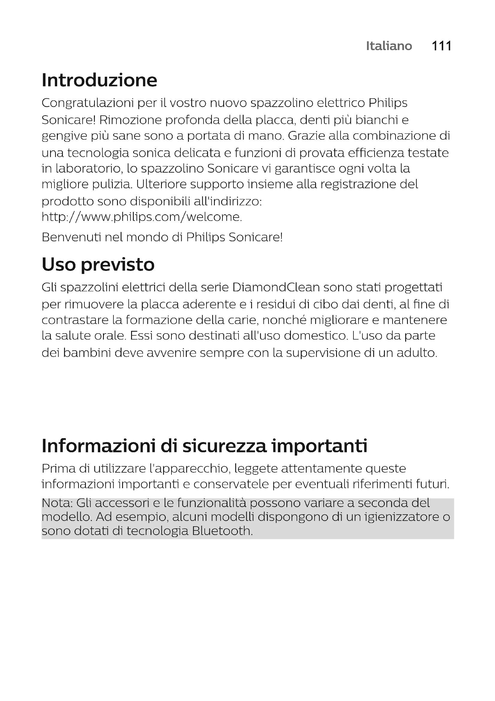 FrançaisItaliano Introduzione Congratulazioni per il vostro nuovo spazzolino elettrico Philips Sonicare! Rimozione profonda della placca, denti più bianchi e gengive più sane sono a portata di mano. Grazie alla combinazione di una tecnologia sonica delicata e funzioni di provata efficienza testate in laboratorio, lo spazzolino Sonicare vi garantisce ogni volta la migliore pulizia. Ulteriore supporto insieme alla registrazione del prodotto sono disponibili all'indirizzo: http://www.philips.com/welcome. Benvenuti nel mondo di Philips Sonicare! Uso previsto Gli spazzolini elettrici della serie DiamondClean sono stati progettati per rimuovere la placca aderente e i residui di cibo dai denti, al fine di contrastare la formazione della carie, nonché migliorare e mantenere la salute orale. Essi sono destinati all'uso domestico. L'uso da parte dei bambini deve avvenire sempre con la supervisione di un adulto. Informazioni di sicurezza importanti Prima di utilizzare l'apparecchio, leggete attentamente queste informazioni importantie conservatele per eventuali riferimenti futuri. Nota: Gli accessori e le funzionalità possono variare a seconda del modello. Ad esempio, alcuni modelli dispongono di un igienizzatore o sono dotati di tecnologia Bluetooth.