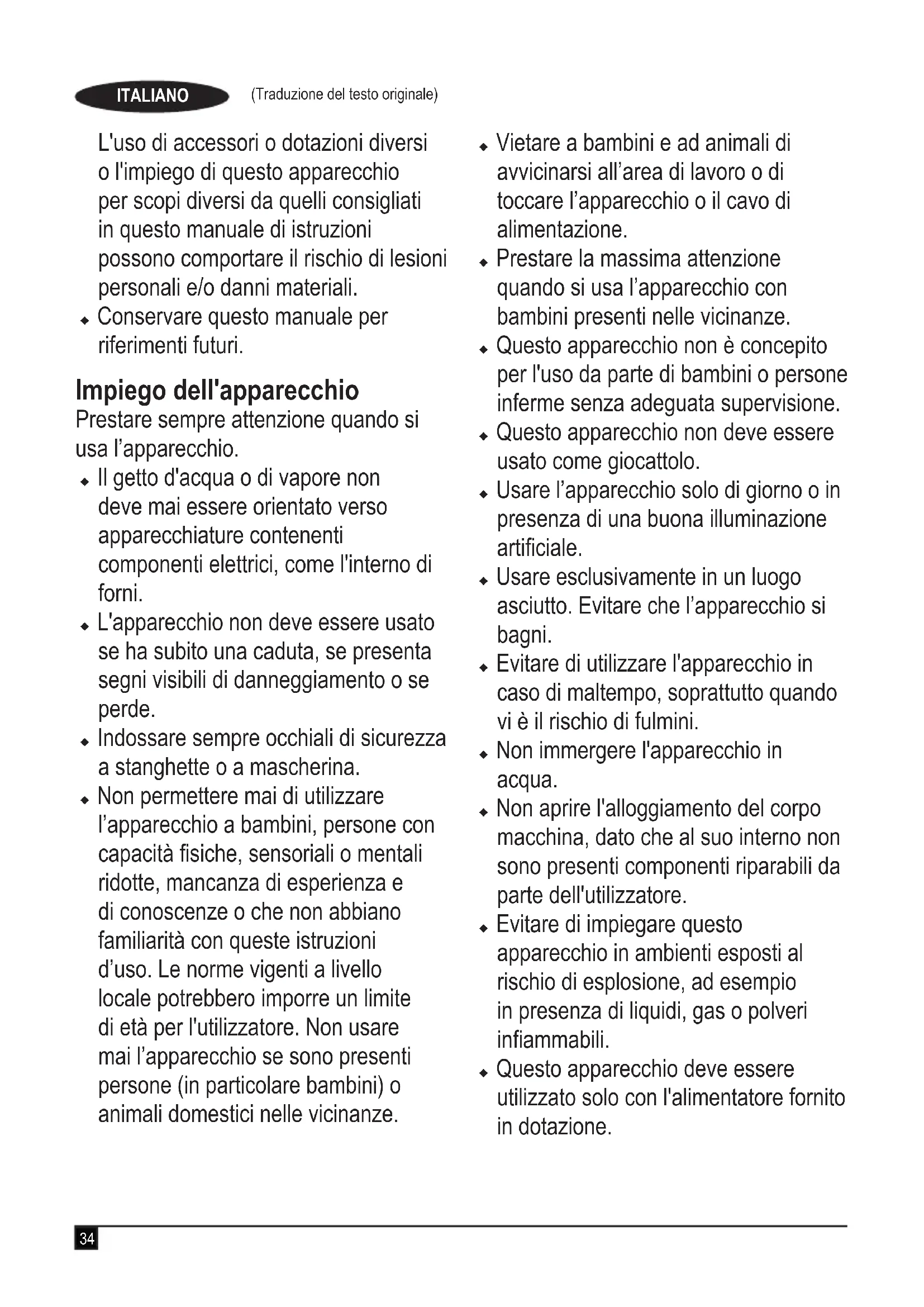 Non esporre l’apparecchio alla pioggia o a un’umidità intensa.38 (Traduzione del testo originale) ITALIANO