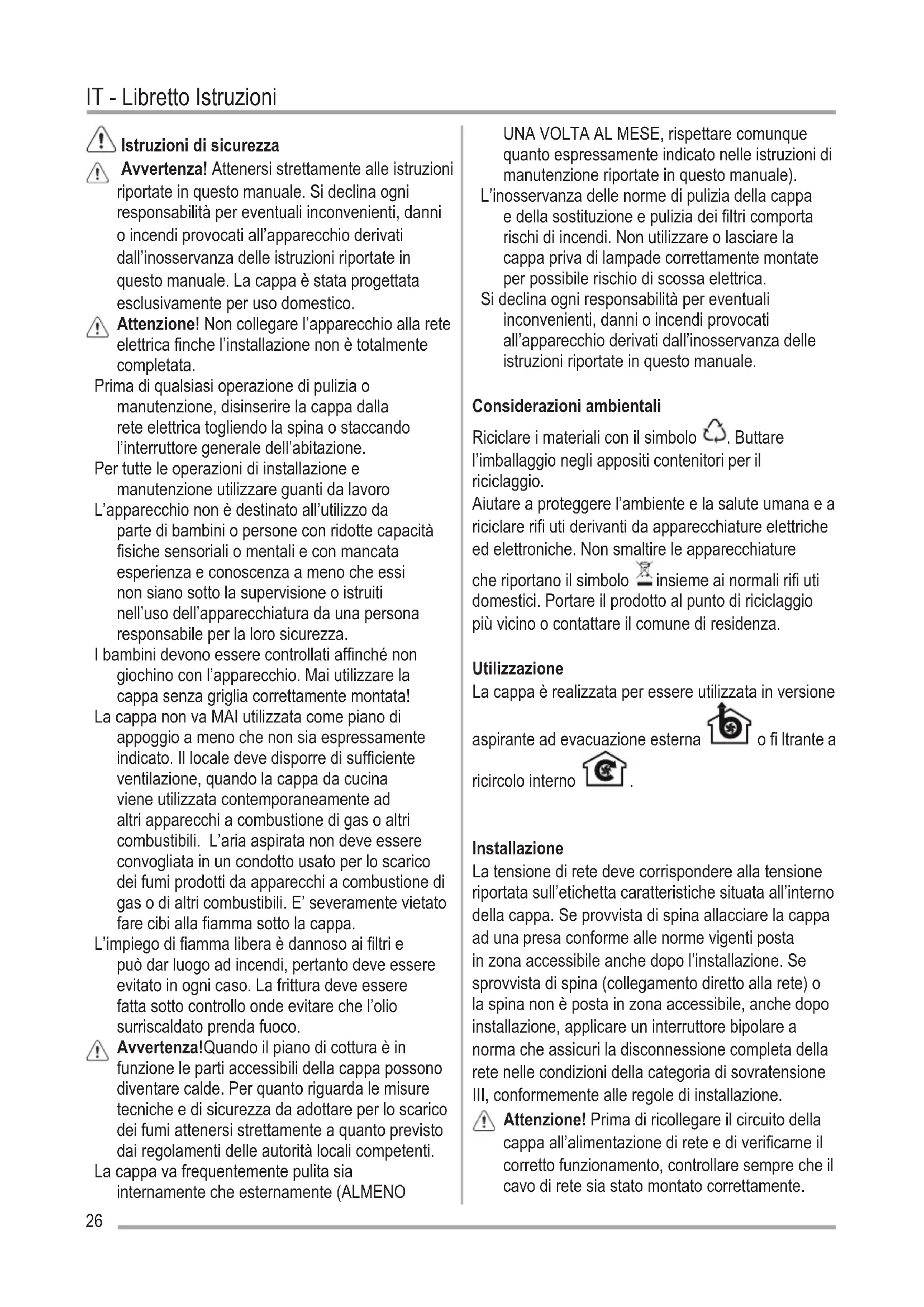 Usar a potência de aspiração no caso de uma maior concentração de vapor de cozimento. Aconselhamos ligar a aspiração 5 minutos antes de iniciar a cozinhar e de deixá-la em funcionamento por aproximadamente 15 minutos após o término do cozimento. Iluminação Desligar o aparelho da rede elétrica; Atenção! Antes de tocar as lâmpadas, certificar- se que estejam frias. Utilize exclusivamente lâmpadas de halogéneo de 12V - 20W max - G4, tomando o cuidado para não as tocar com as mãos.26 Istruzioni di sicurezza Avvertenza! Attenersi strettamente alle istruzioni riportate in questo manuale. Si declina ogni responsabilità per eventuali inconvenienti, danni o incendi provocati all’apparecchio derivati dall’inosservanza delle istruzioni riportate in questo manuale. La cappa è stata progettata esclusivamente per uso domestico. Attenzione! Non collegare l’apparecchio alla rete elettrica finche l’installazione non è totalmente completata. Prima di qualsiasi operazione di pulizia o manutenzione, disinserire la cappa dalla rete elettrica togliendo la spina o staccando l’interruttore generale dell’abitazione. Per tutte le operazioni di installazione e manutenzione utilizzare guanti da lavoro L’apparecchio non è destinato all’utilizzo da parte di bambini o persone con ridotte capacità fisiche sensoriali o mentali e con mancata esperienza e conoscenza a meno che essi non siano sotto la supervisione o istruiti nell’uso dell’apparecchiatura da una persona responsabile per la loro sicurezza. I bambini devono essere controllati affinché non giochino con l’apparecchio. Mai utilizzare la cappa senza griglia correttamente montata! La cappa non va MAI utilizzata come piano di appoggio a meno che non sia espressamente indicato. Il locale deve disporre di sufficiente ventilazione, quando la cappa da cucina viene utilizzata contemporaneamente ad altri apparecchi a combustione di gas o altri combustibili. L’aria aspirata non deve essere convogliata in un condotto usato per lo scarico dei fumi prodotti da apparecchi a combustione di gas o di altri combustibili. E’ severamente vietato fare cibi alla fiamma sotto la cappa. L’impiego di fiamma libera è dannoso ai filtri e può dar luogo ad incendi, pertanto deve essere evitato in ogni caso. La frittura deve essere fatta sotto controllo onde evitare che l’olio surriscaldato prenda fuoco. Avvertenza!Quando il piano di cottura è in funzione le parti accessibili della cappa possono diventare calde. Per quanto riguarda le misure tecniche e di sicurezza da adottare per lo scarico dei fumi attenersi strettamente a quanto previsto dai regolamenti delle autorità locali competenti. La cappa va frequentemente pulita sia internamente che esternamente (ALMENO UNA VOLTA AL MESE, rispettare comunque quanto espressamente indicato nelle istruzioni di manutenzione riportate in questo manuale). L’inosservanza delle norme di pulizia della cappa e della sostituzione e pulizia dei filtri comporta rischi di incendi. Non utilizzare o lasciare la cappa priva di lampade correttamente montate per possibile rischio di scossa elettrica. Si declina ogni responsabilità per eventuali inconvenienti, danni o incendi provocati all’apparecchio derivati dall’inosservanza delle istruzioni riportate in questo manuale. Considerazioni ambientali Riciclare i materiali con il simbolo . Buttare l’imballaggio negli appositi contenitori per il riciclaggio. Aiutare a proteggere l’ambiente e la salute umana e a riciclare rifi uti derivanti da apparecchiature elettriche ed elettroniche. Non smaltire le apparecchiature che riportano il simbolo insieme ai normali rifi uti domestici. Portare il prodotto al punto di riciclaggio più vicino o contattare il comune di residenza. Utilizzazione La cappa è realizzata per essere utilizzata in versione aspirante ad evacuazione esterna o fi ltrante a ricircolo interno