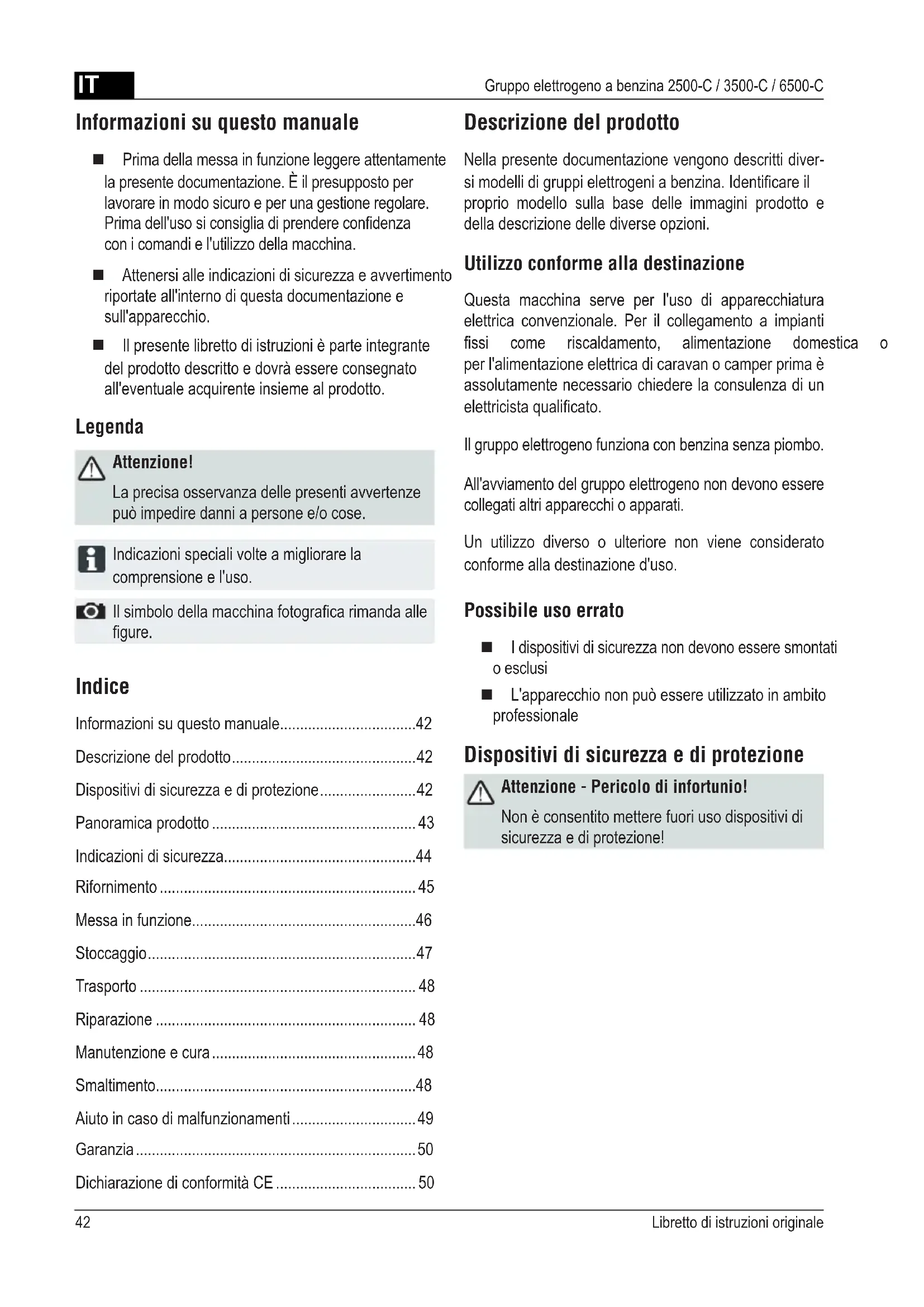 - Gruppo elettrogeno a benzina 2500-C / 3500-C / 6500-C Indice Informazioni su questo manuale p. 42