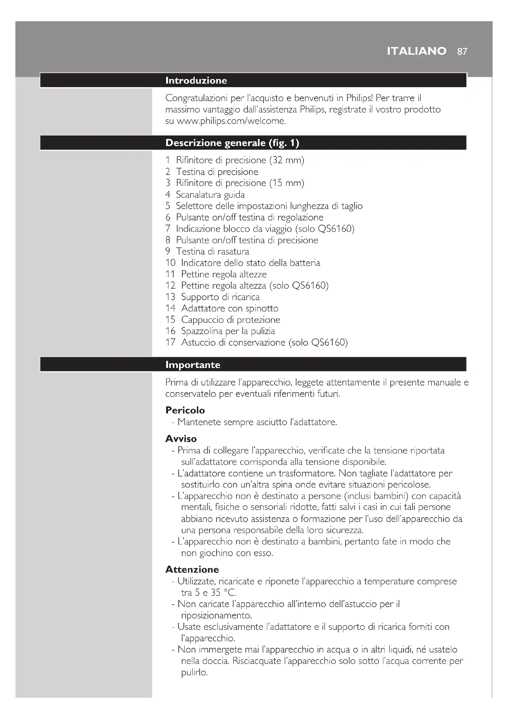 - senza pettine = 0,5 mm - 1/32” 1 Tenete l’apparecchio nella posizione di rinitura, con la testina di precisione rivolta verso l’alto e la testina di rasatura verso il basso. 2 Fate scorrere il pettine nella scanalatura posta sull’apparecchio no a farlo scattare in posizione. 3 Premete il selettore delle impostazioni di lunghezza e muovetelo da sinistra a destra o viceversa per selezionare un’impostazione. italiano90- La linea sopra il selettore delle impostazioni di lunghezza mostra l’impostazione selezionata. 4 Premete una volta il pulsante on/off della testina di precisione per accenderla. , Solo QS6160: il pulsante on/off si accende per indicare che la testina di precisione è in funzione. 5 Per regolare i peli, muovere lentamente il pettine regola altezza sui peli. Consigli - Controllate sempre che l’estremità del pettine regola altezza sia rivolta nella direzione nella quale state muovendo l’apparecchio. - Controllate che la parte piatta del pettine regola altezza sia sempre perfettamente a contatto con la pelle, per ottenere un risultato uniforme. - Poiché i capelli crescono in diverse direzioni, anche l’apparecchio si deve muovere in più punti (verso l’alto, verso il basso e in diagonale). - Potete accendere la testina di precisione mentre la testina di rasatura è in funzione. In questo caso, quest’ultima si spegne subito. - La regolazione dell’altezza dei peli risulta più facile con la pelle e i peli asciutti. 6 Quando avete nito, premete di nuovo il pulsante on/off della testina di precisione per spegnerla. Rinitura senza pettine Il pettine tiene la testina di precisione a una distanza predenita dalla testina. Potete usare la testina di precisione senza il pettine. Se usate la testina di precisione senza pettine, i peli verranno tagliati molto vicino alla cute (circa. 0,5 mm).